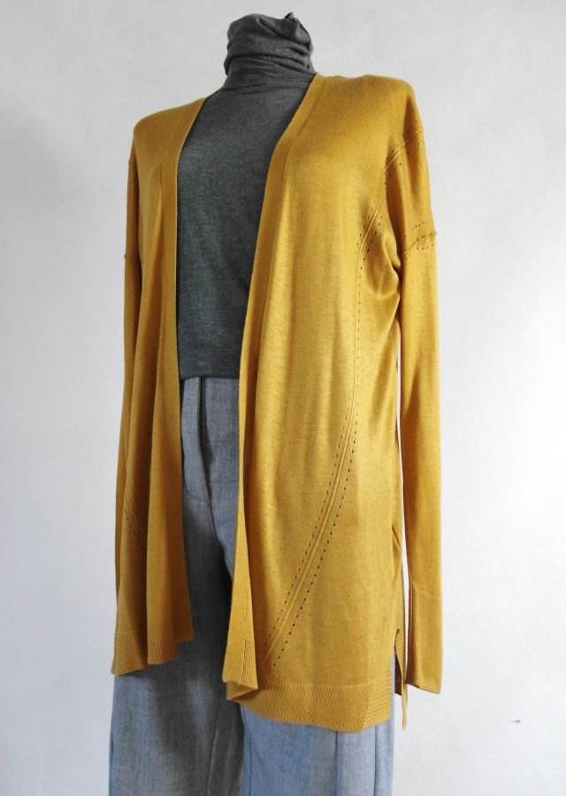 piękny, ciepły kolor miodowy, bursztynowy - idealny do szarości, granatu, ecru.jest delikatny, lekko satynowy. Na bokach ma rozcięcia.Rękawy dosyć wąskie.
