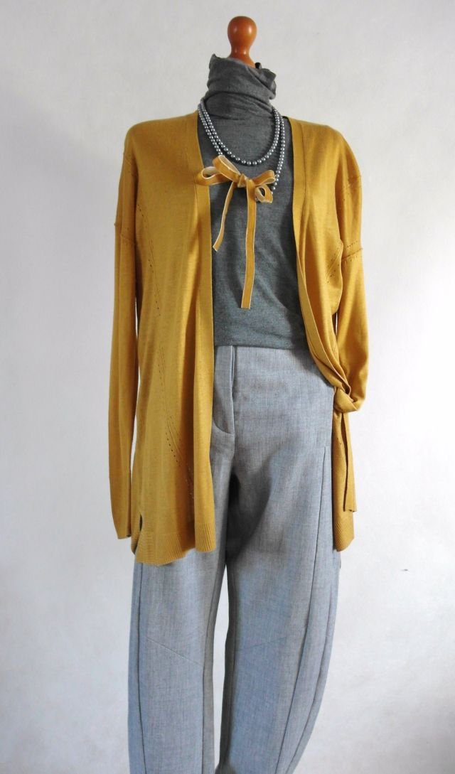 piękny, ciepły kolor miodowy, bursztynowy - idealny do szarości, granatu, ecru.jest delikatny, lekko satynowy. Na bokach ma rozcięcia.Rękawy dosyć wąskie.