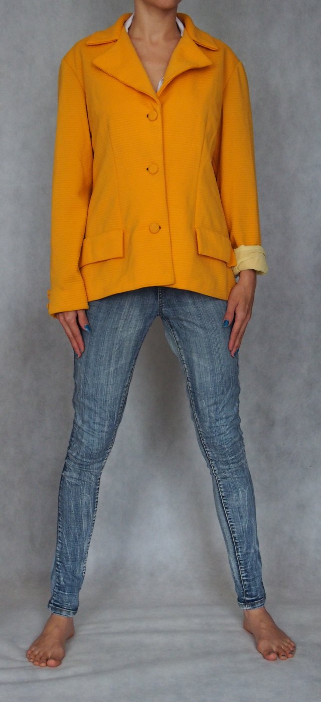 Cudowny miodowy blezer w poprzeczne pasy. Idealny na wiosnę/lato. Marynareczkę jak widać na zdjęciu można nosić z modnie podwiniętymi rękawami, bądź klasycznie z długim rękawkiem.