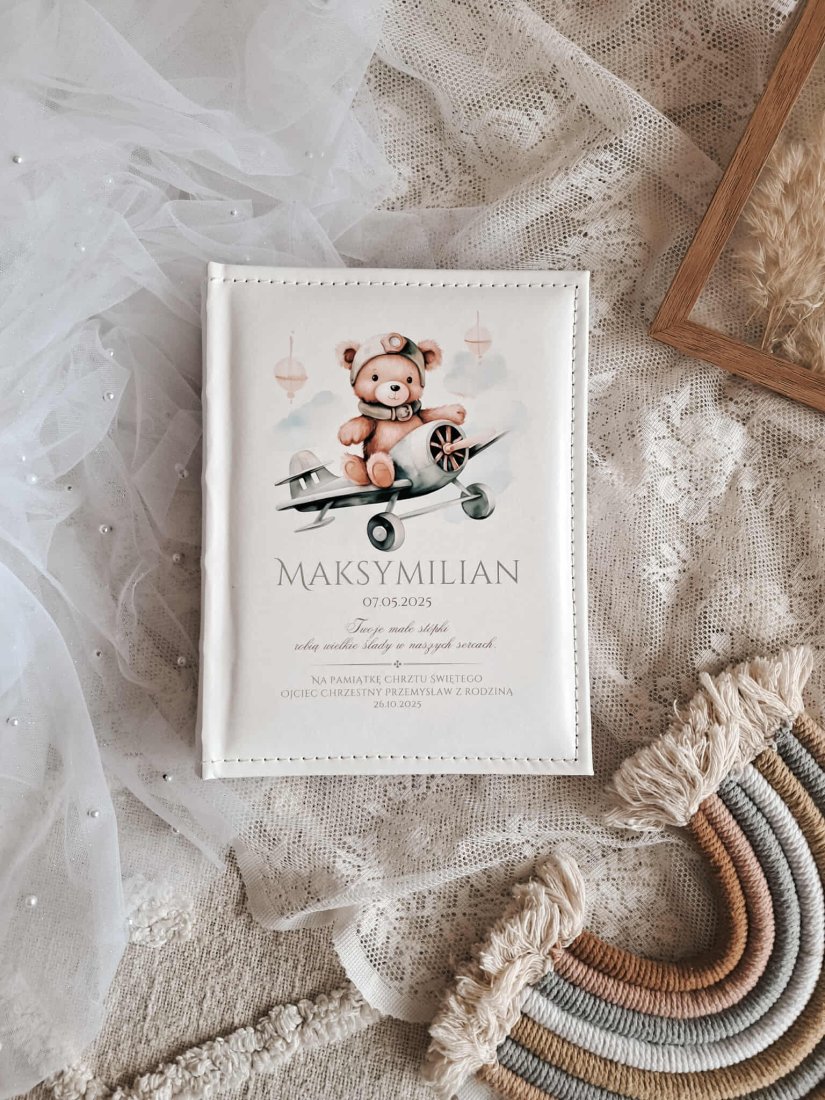 Niezwykły prezent na chrzest święty czy narodziny dziecka- piękny album z uroczą grafiką misia w samolocie.
