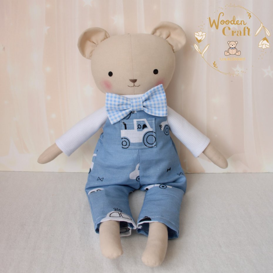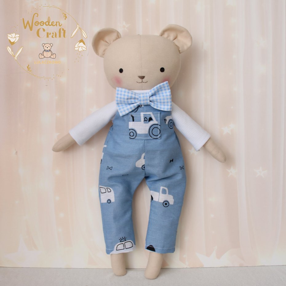 Przeurocza przytulanka, miś w kolorze beżowym, uszyty ręcznie z najwyższą starannością, ubrany w mięciutki biały sweterek i spodenki ogrodniczki w kolorze niebieskim z motywem autek oraz uroczą błękitną muszkę. Wykonany ze 100% bawełny, wypełniony antyalergiczną kulką silikonową. Oczka malowane wodoodpornym markerem, nosek i buźka wyszyte muliną. Górne i dolne łapki układają się luźno, misiulek siedzi z podparciem. Sweterek i spodenki można swobodnie zdejmować, w pasie wszyta jest gumeczka, muszka również jest na gumeczce.