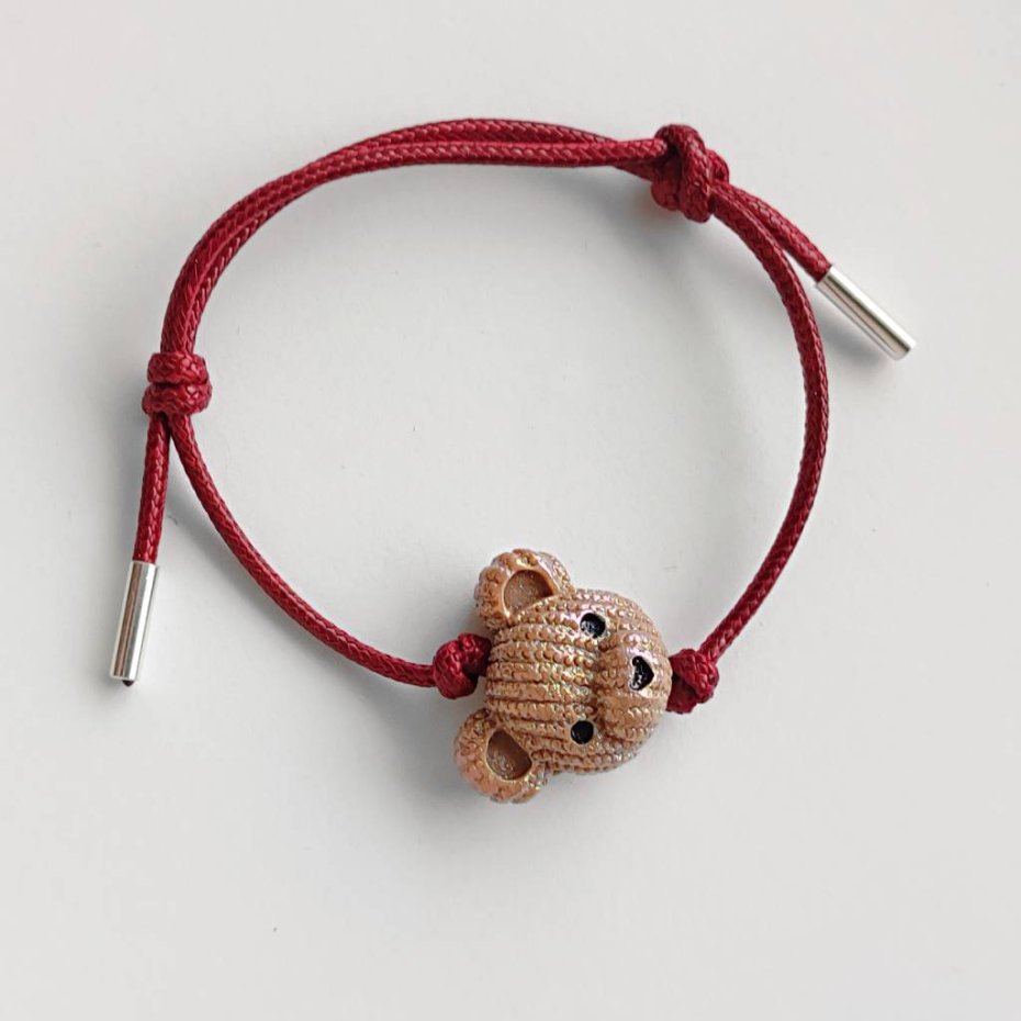 MIŚ bransoletka- uroczy design. Nietuzinkowy dodatek idealnie stanowi uzupełnienie swobodnych, casualowych stylizacji. Bransoletka wykonana są z :koralik akrylowy – miś – (23X 19 mm), ozdobny sznurek, srebro pr. 925. Ten niebanalny drobiazg na pewno wywoła uśmiech na Twojej twarzy.