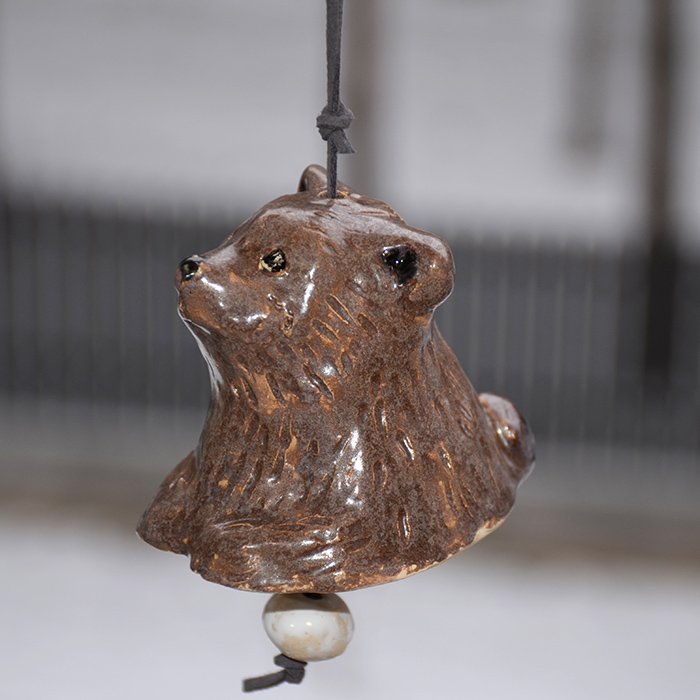 Mały niedźwiadek lub słodki miś, jak kto woli.... Ręcznie formowany dzwonek, szkliwiony i dwukrotnie wypalany w piecu w temp. 1080 stopni C. Kolor szkliw: czarne, brązowe efekt, biel. Pod spodem szkliwo przeźroczyste z efektem spękania. Wymiary: wysokość (nie licząc rzemienia i zawieszek ok 8 cm, średnica ok 7 cm. Dzwoneczek jest jedyny w swoim rodzaju i niepowtarzalny. Dzwoni naprawdę głośno.