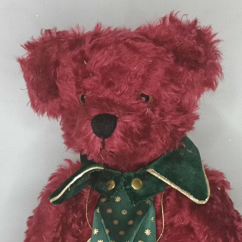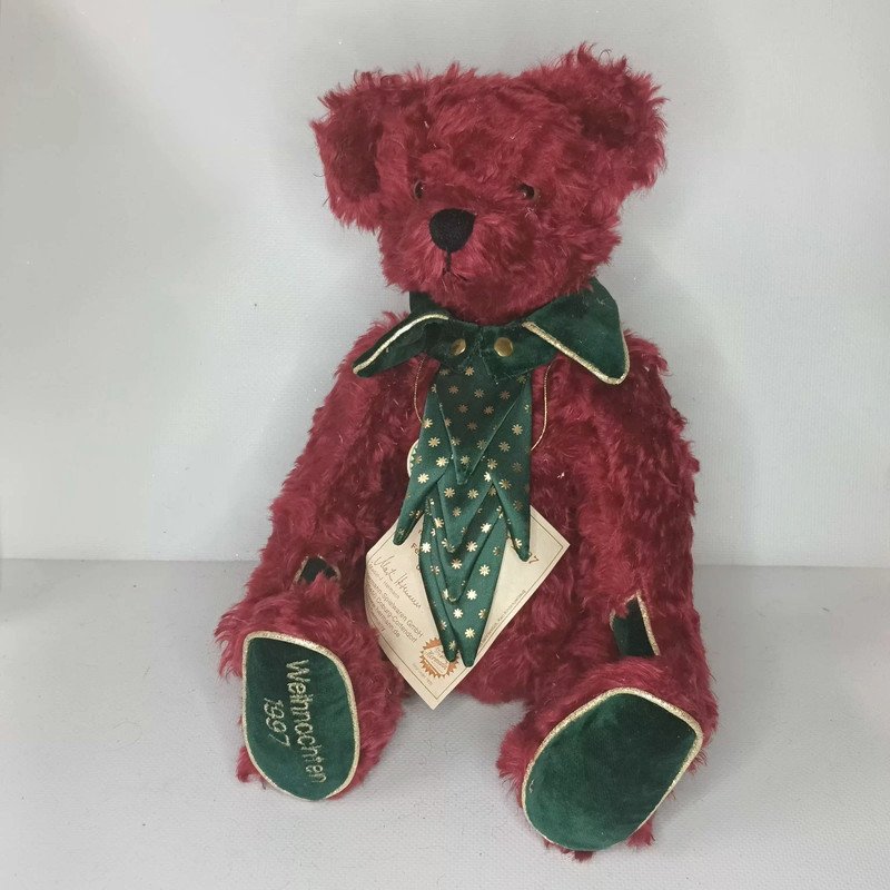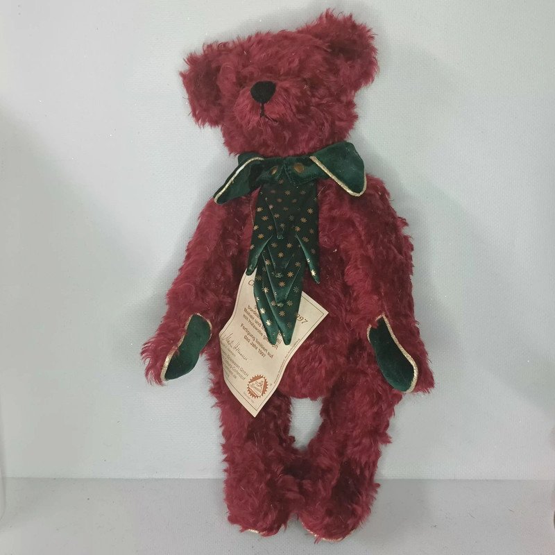 Kolekcjonerski miś marki Hermann Bordeaux Christmas Bear 1997. Wykonany z moheru, wypełniony trocinami.