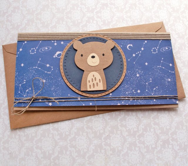urocza kartka z okazji narodzin bobasa/ chrztu lub urodzinek - wykonana na bazie kartonu eko-kraft (100% makulatury), ozdobiona wzorzystym kartonem; na środku zamocowany duży, przestrzenny element z przesłodkim misiem;