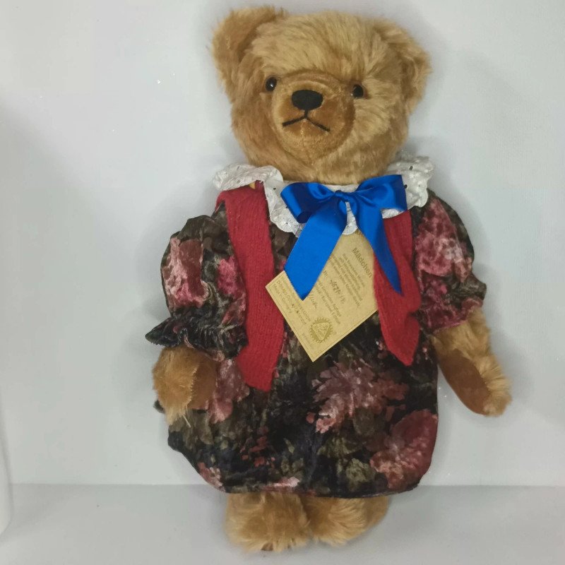 Kolekcjonerski miś marki Hermann Mädchen numer 052/250E. Wykonany z moheru, wypełniony trocinami. W aksamitnej sukience i moherowej kamizelce.