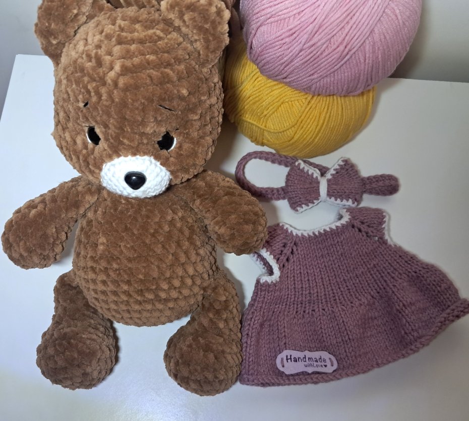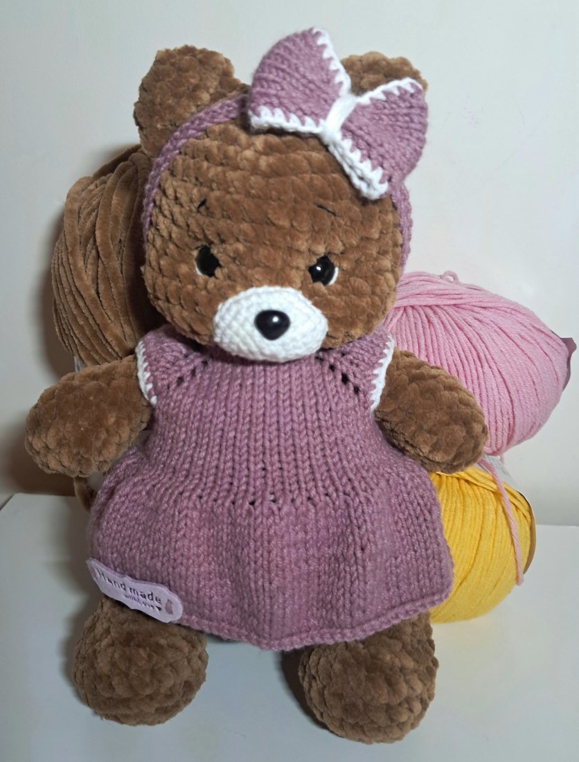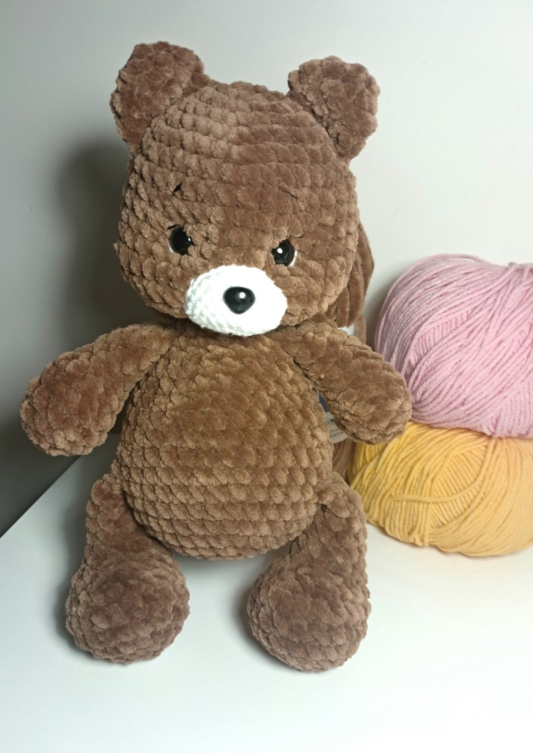 Ręcznie wykonana przytulanka w formie misia pluszowego, idealna do przytulania i dekoracji dziecięcego pokoju. Zabawka wykonana na szydełku z dbałością o każdy detal. Wysokość około 22 sm.