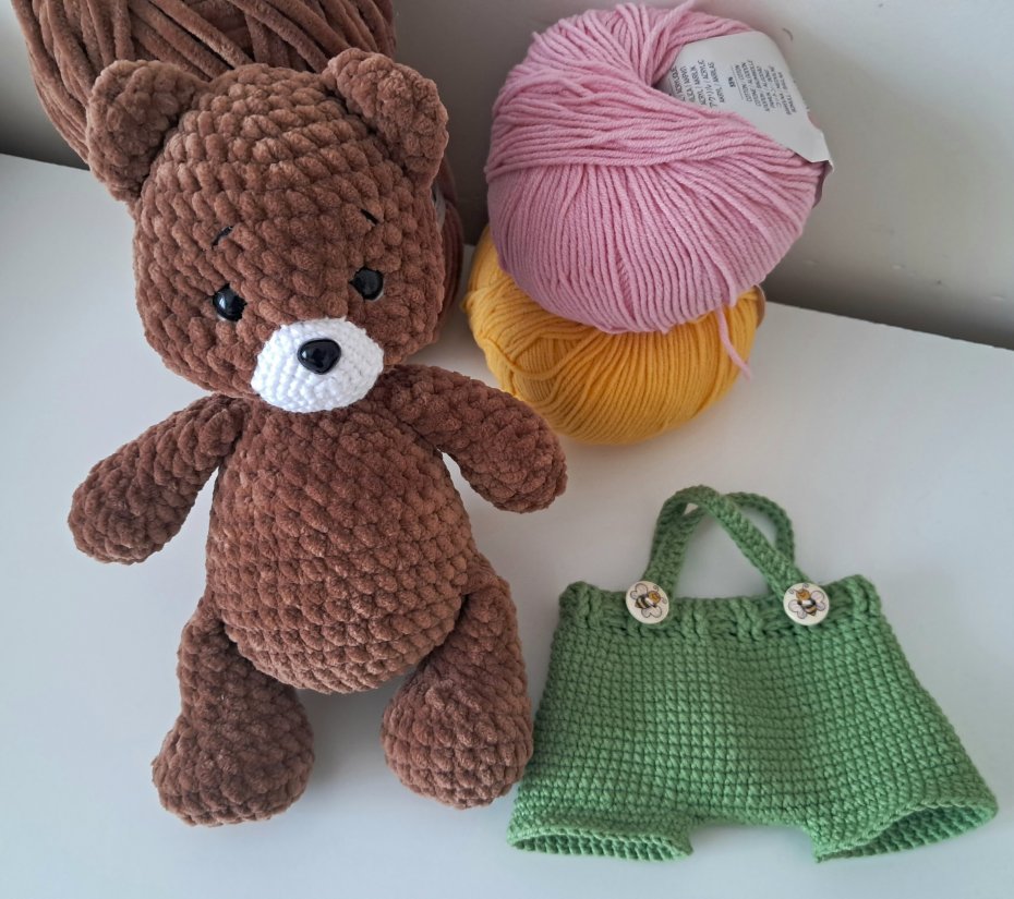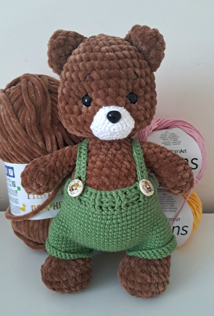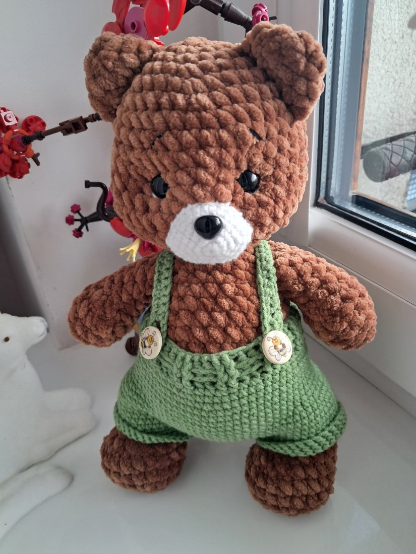 Ręcznie wykonana przytulanka w formie misia pluszowego, idealna do przytulania i dekoracji dziecięcego pokoju. Zabawka wykonana na szydełku z dbałością o każdy detal. Wysokość około 22 sm.