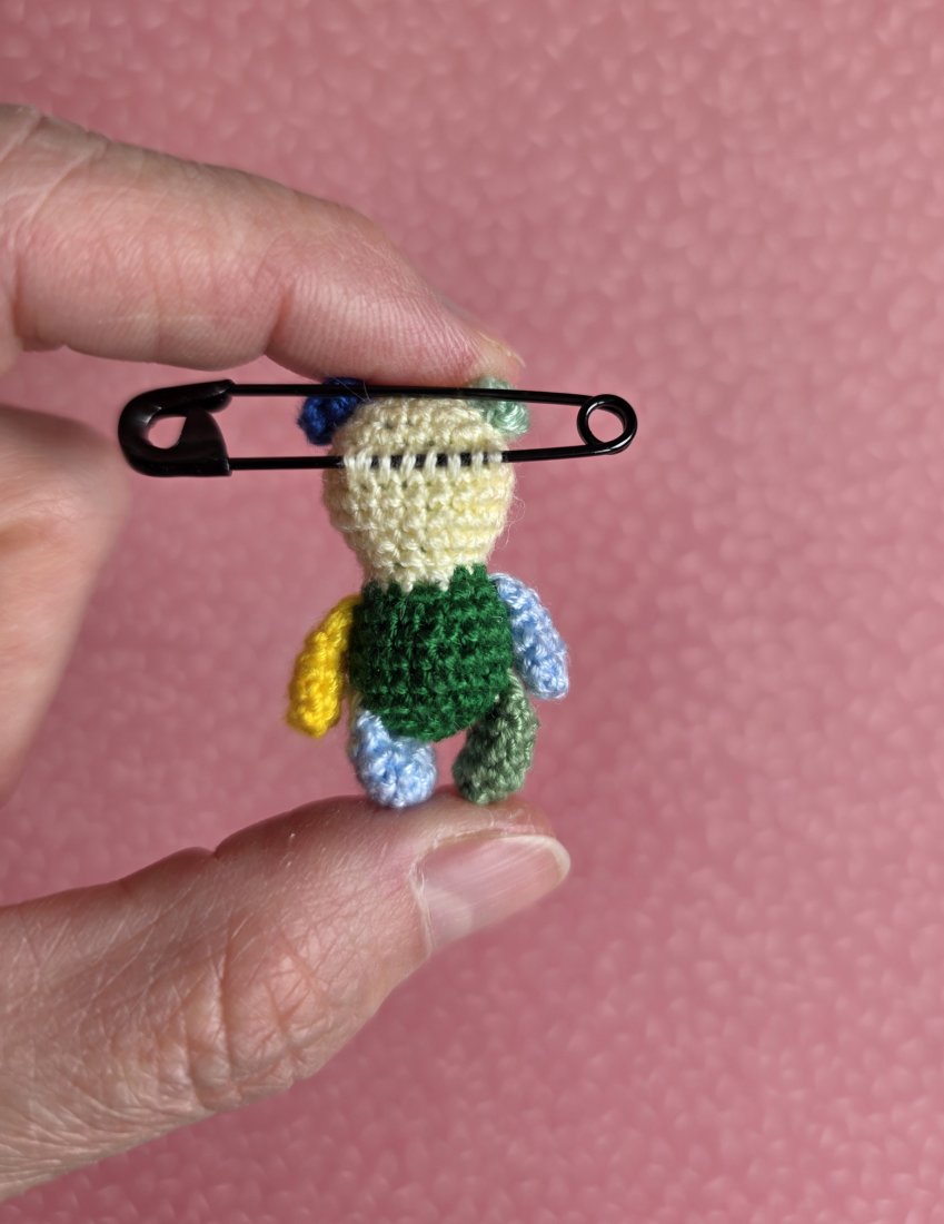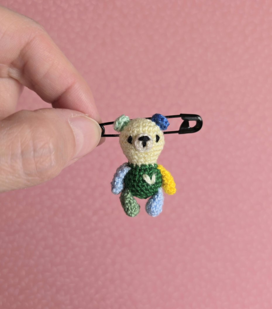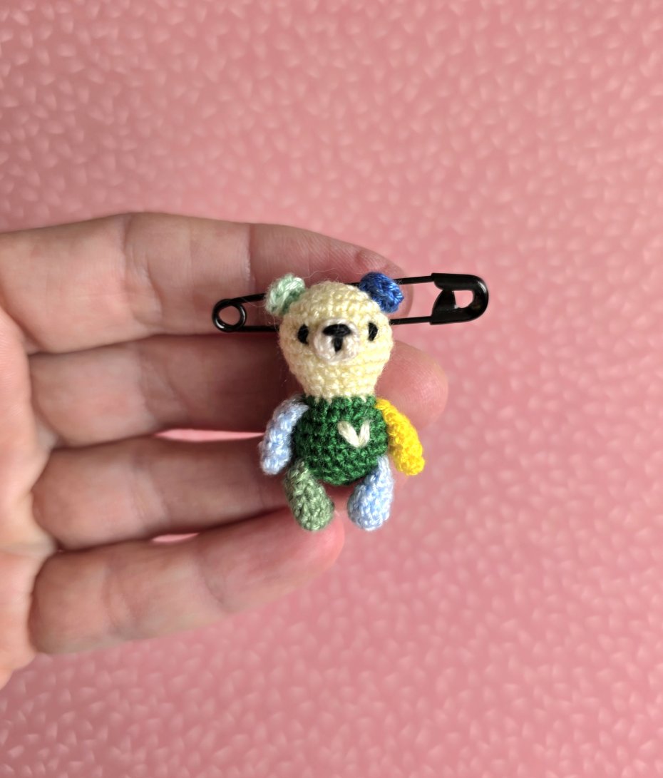 Malutki miś w postaci przypinki, na czarnej agrafce. Miś ma około 3,5 cm.