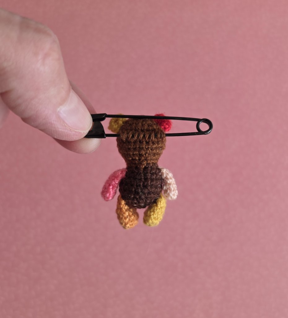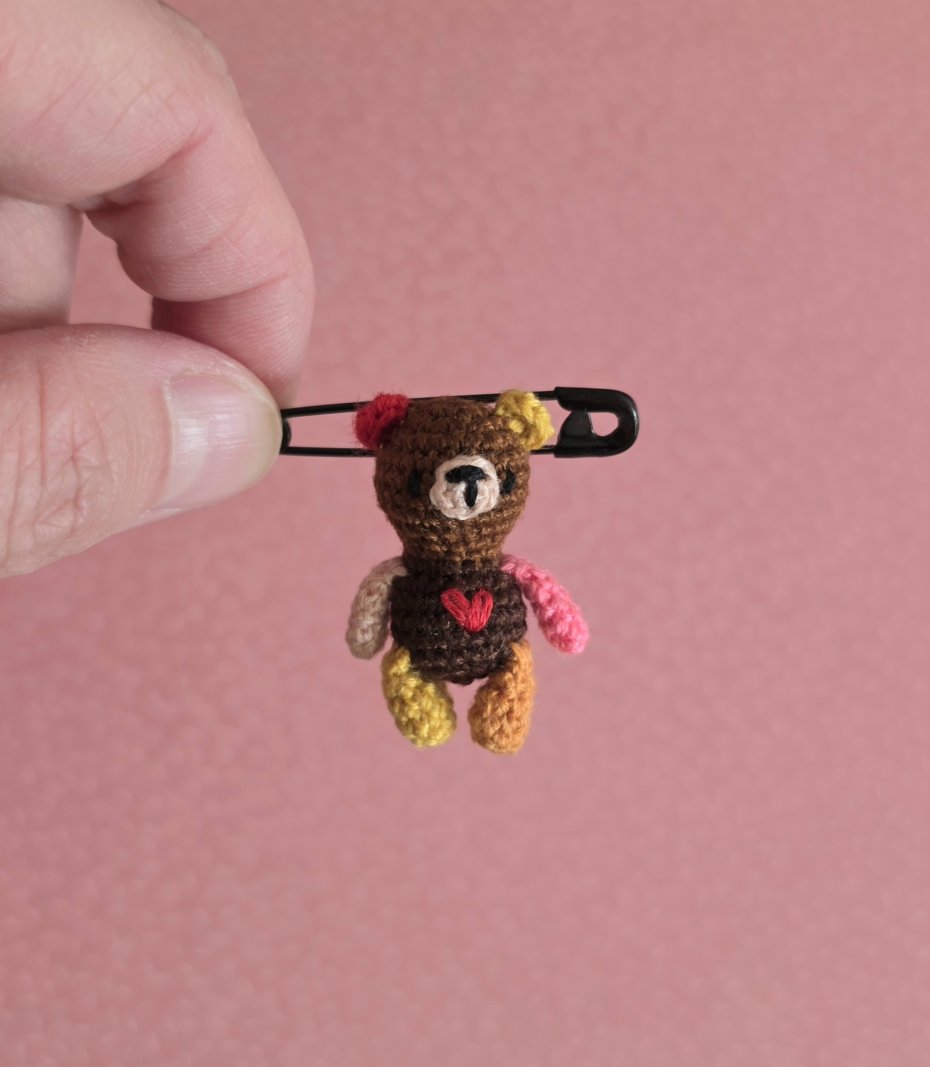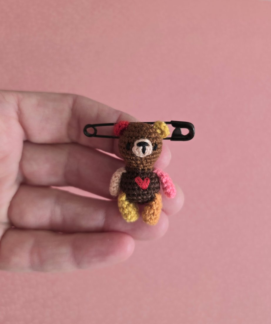 Malutki kolorowy miś w postaci przypinki, na czarnej agrafce. Miś ma około 3,5 cm.