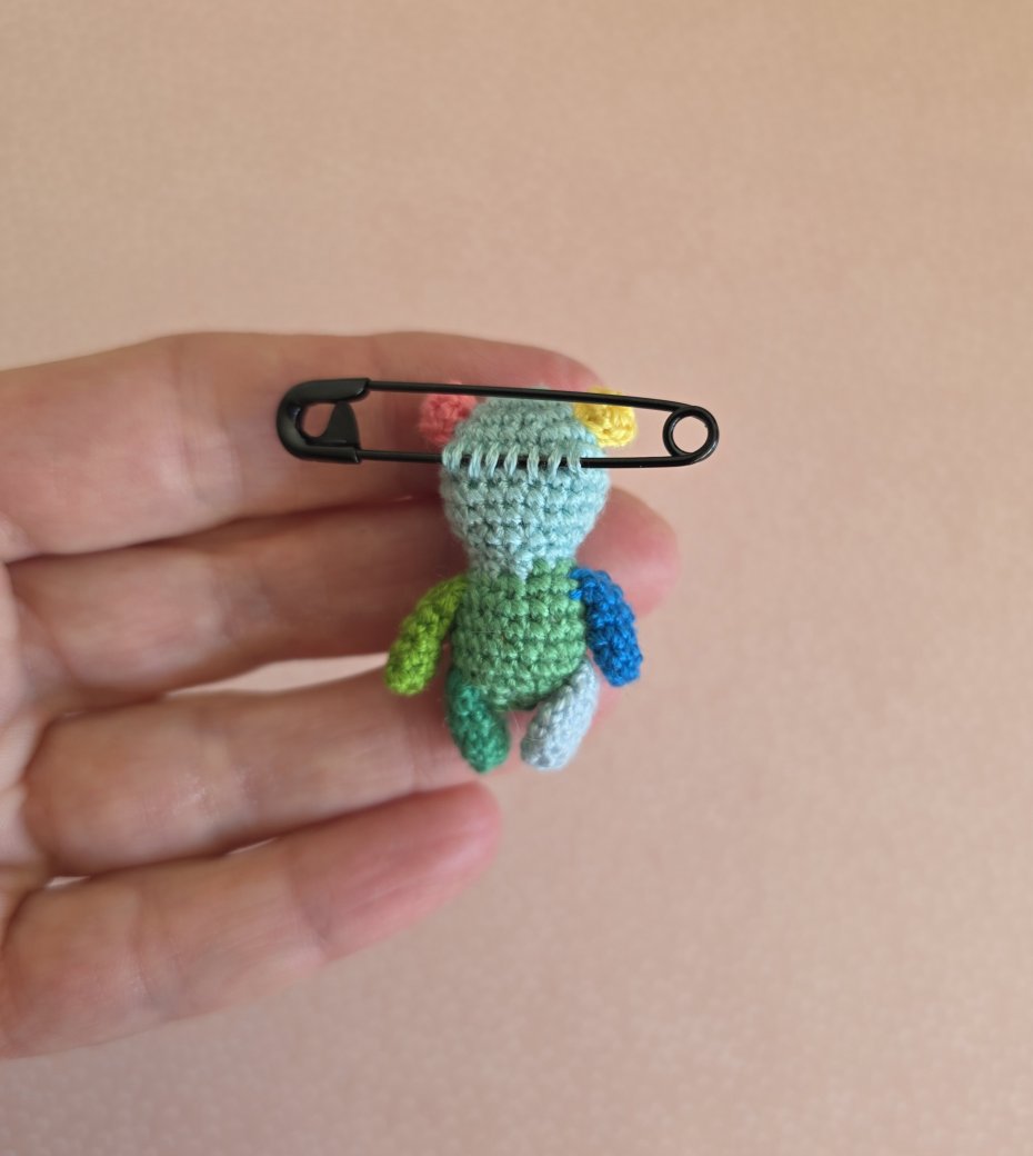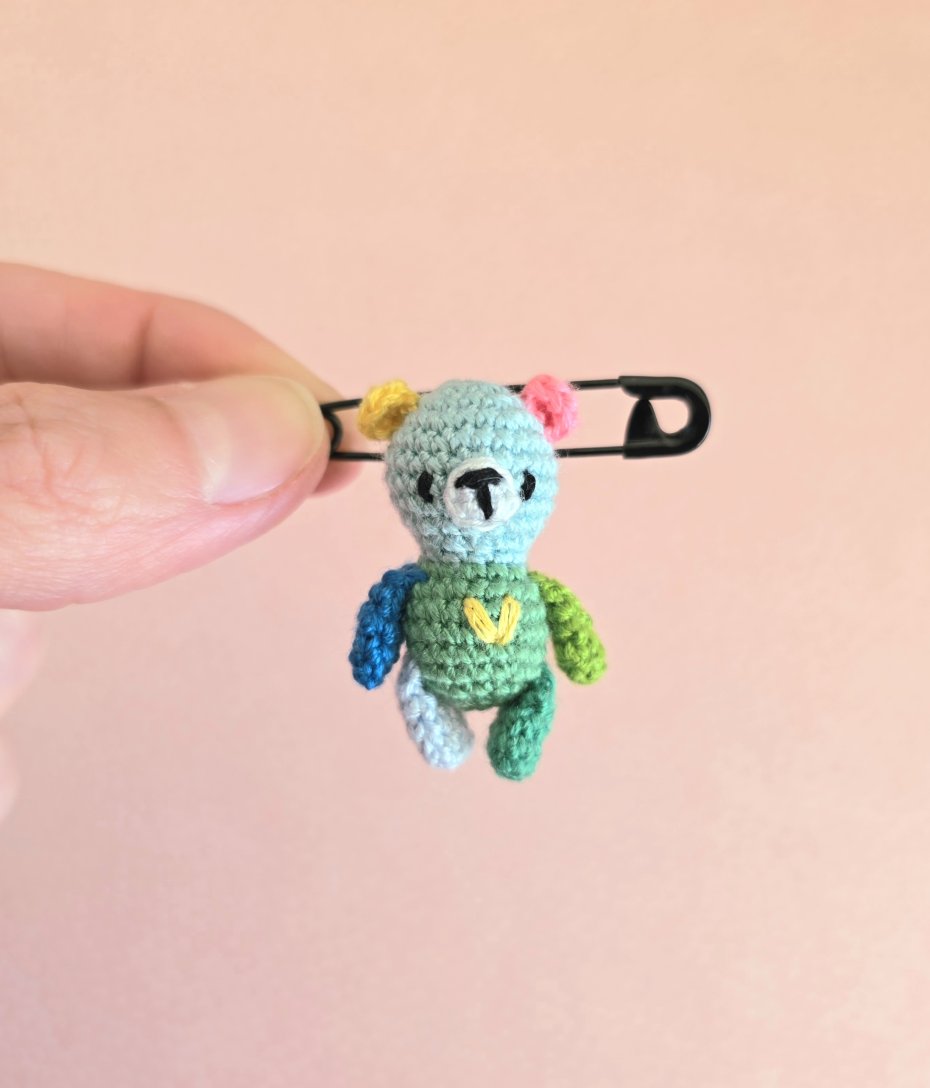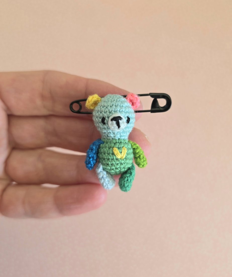 Malutki miś w postaci przypinki, na czarnej agrafce. Miś ma niecałe 4 cm.