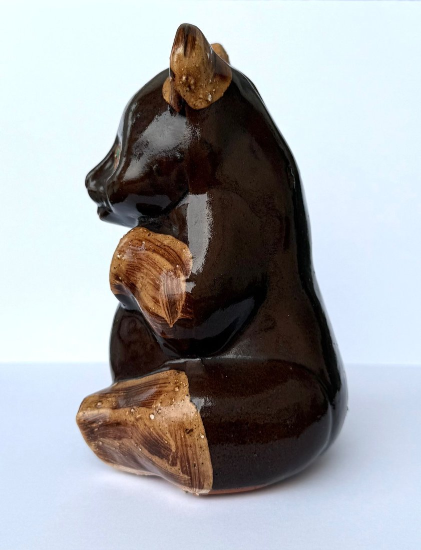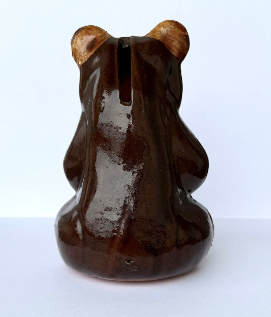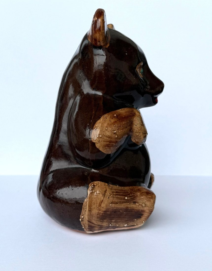 Miś ma charakterystyczną dla epoki formę: siedzi z uniesionymi łapkami, a całość pokryta jest pięknym, błyszczącym brązowym szkliwem. Ręcznie malowany.