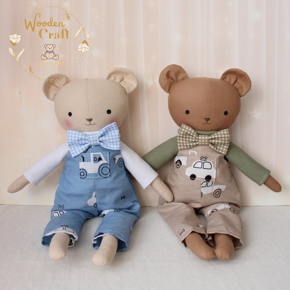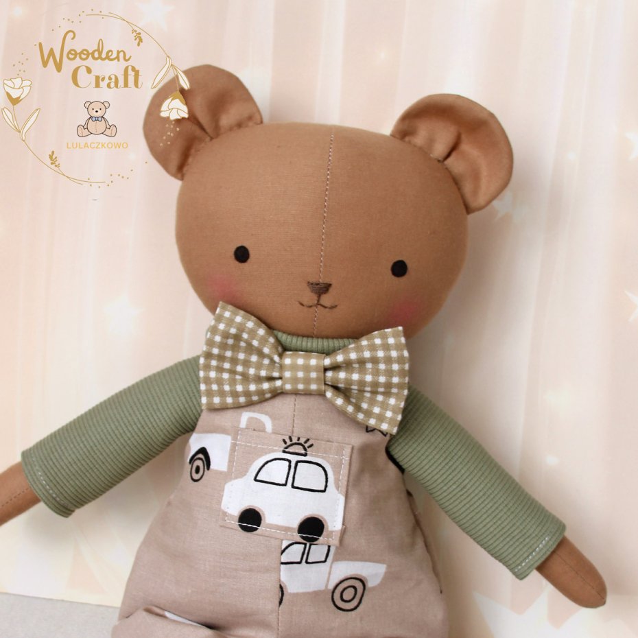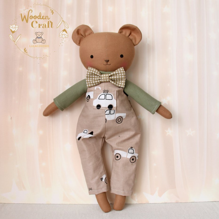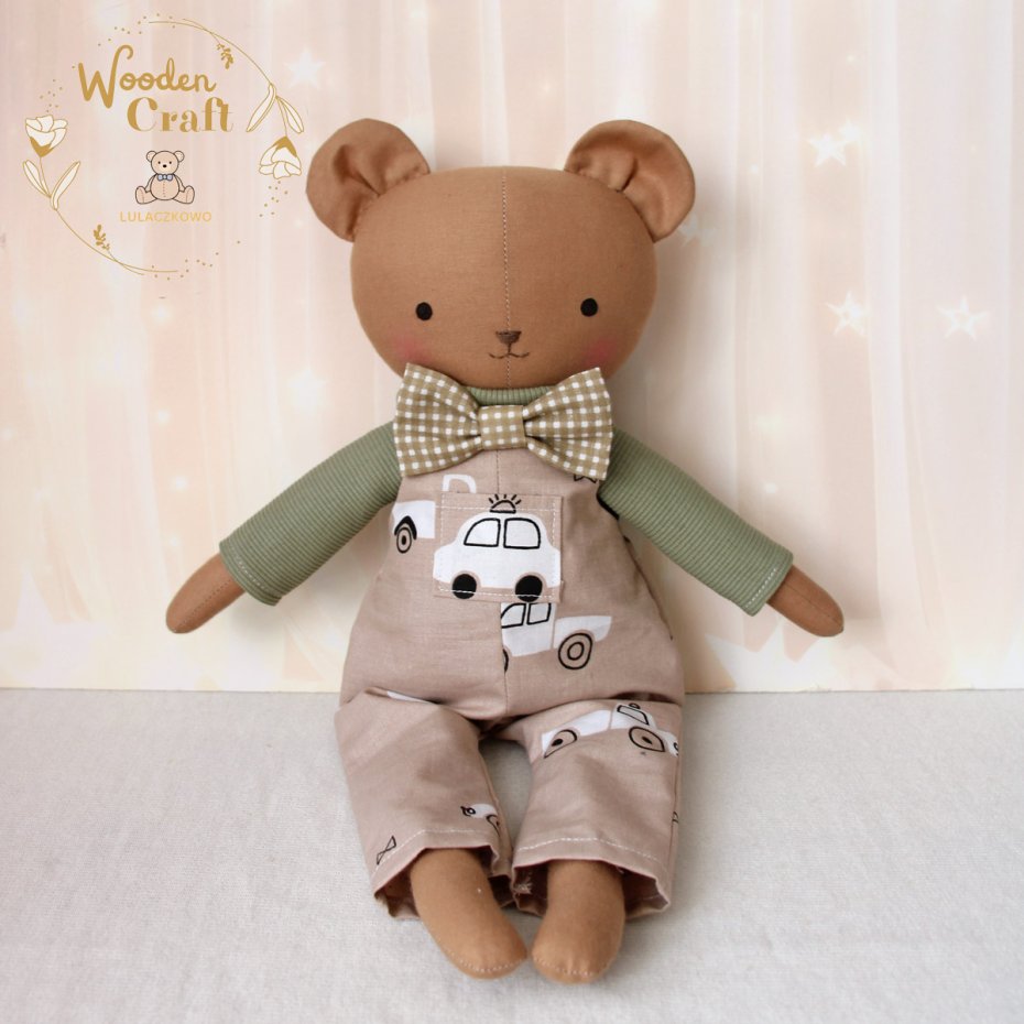 Przeurocza przytulanka, miś w kolorze brązowym, uszyty ręcznie z najwyższą starannością, ubrany w mięciutki oliwkowy sweterek i spodenki ogrodniczki w kolorze beżu z motywem autek oraz uroczą beżową muszkę. Wykonany ze 100% bawełny, wypełniony antyalergiczną kulką silikonową. Oczka malowane wodoodpornym markerem, nosek i buźka wyszyte muliną. Górne i dolne łapki układają się luźno, misiulek siedzi z podparciem. Sweterek i spodenki można swobodnie zdejmować, w pasie wszyta jest gumeczka, muszka również jest na gumeczce.