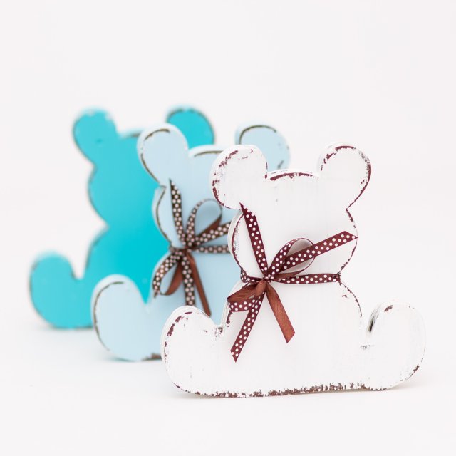 Drewniany miś z kokardą, ręcznie malowany- ciekawy dodatek do wystroju wnętrza dla dużych i małych.