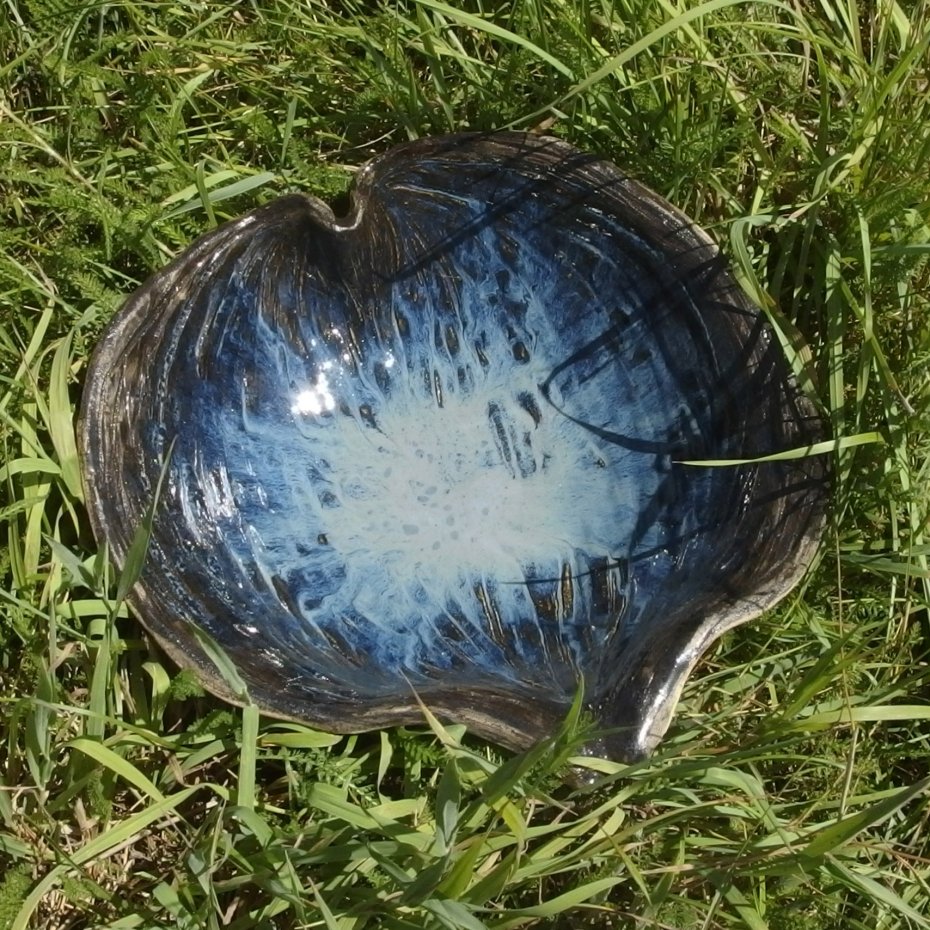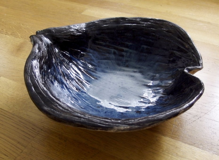 Duża misa cermiczna, ręznie robiona. lnspirowana organiczną formą z natury. Pięknie wyglądają w niej owoce lub inne świeżo zebrane płody natury. Idealna na solidny drewniany stół w sielskim domu. Szkliwo w odcieniach od jasnego błękitu do czerni. Z zewnątrz nieszkliwiona glina, patynowana angobą. Wymiary zewnętrzne ca. 32x31x10 cm.