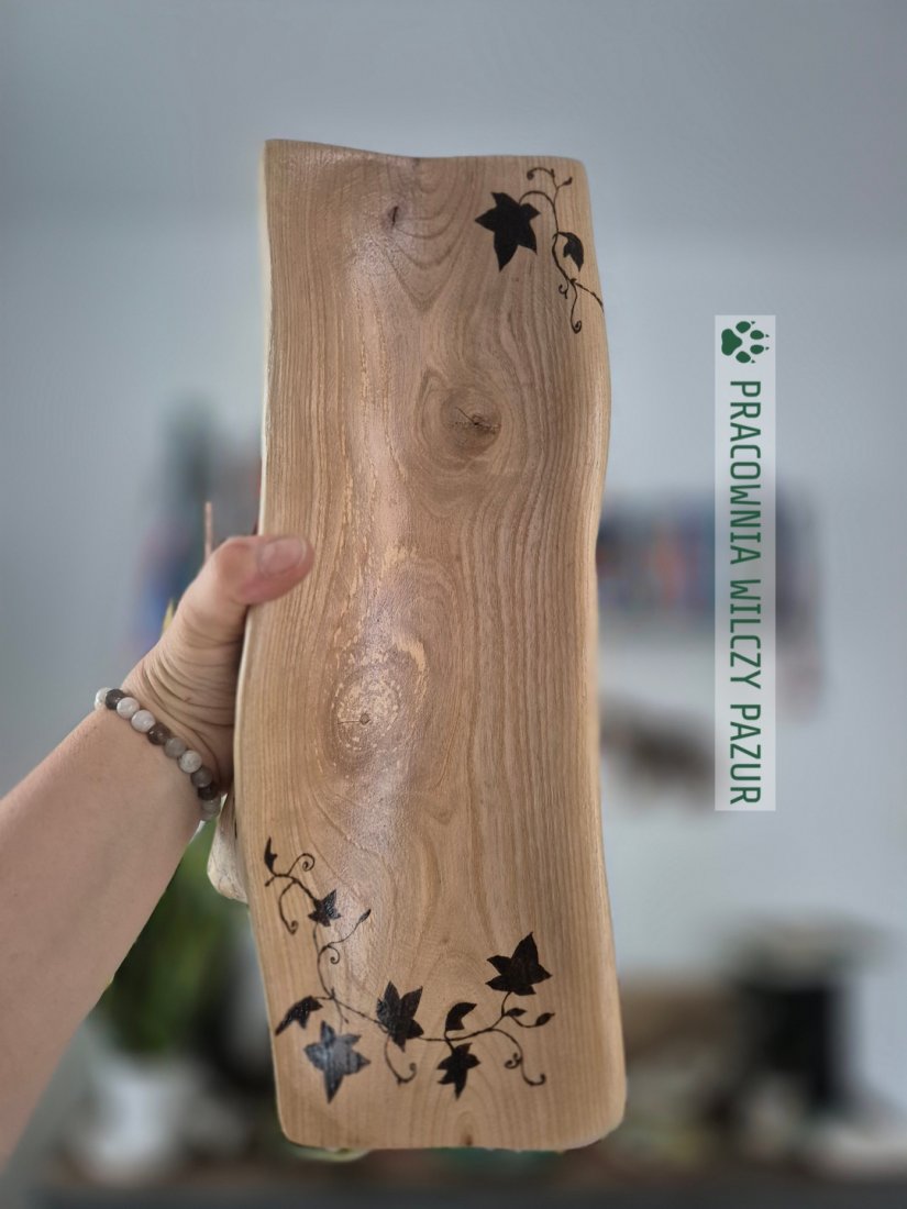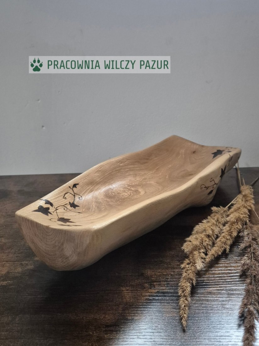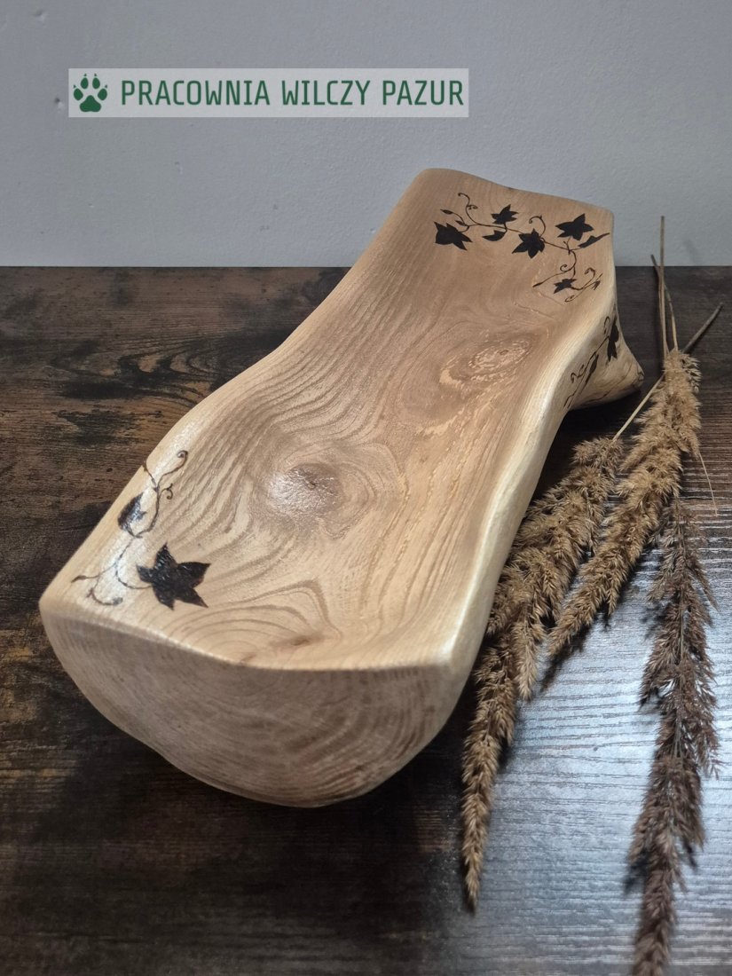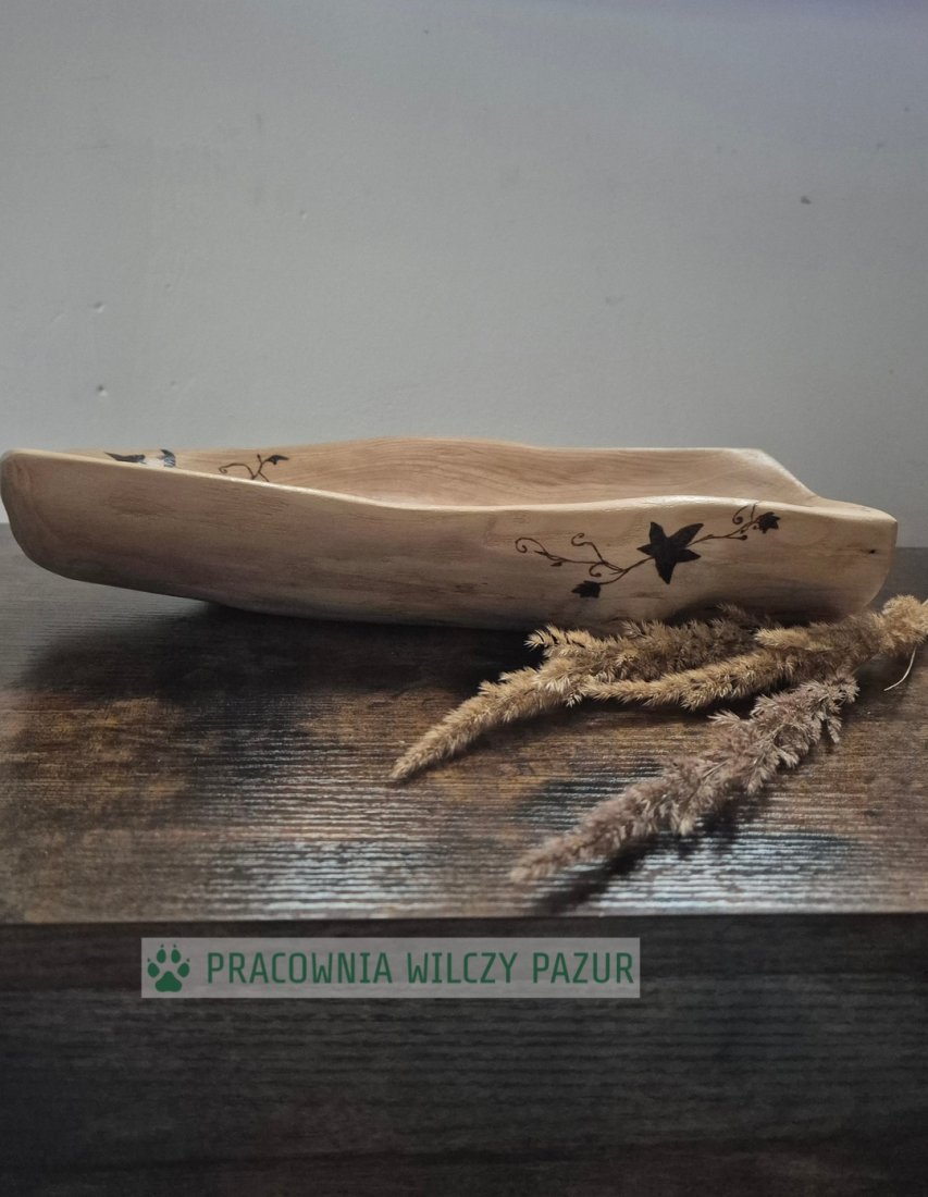 Misa wyrzeźbiona z litego drewna i ozdobiona wypalanym ręcznie wzorem, przedstawiającym liście bluszczu. Została wyrzeźbiona ręcznie, więc jej powierzchnia nie jest idealnie gładka, a kształt pozostał bardzo naturalny. Taka misa będzie na pewno świetnym prezentem dla każdego miłośnika rustykalnych, naturalnych dekoracji. W dodatku jest solidna i stabilna, z powodzeniem może posłużyć jako misa na owoce ( zabezpieczona została preparatem do kontaktu z żywnością) lub do przechowywania biżuterii, drobiazgów , czy po prostu jako przedmiot dekoracyjny.