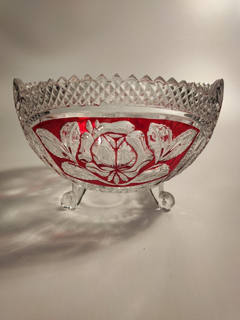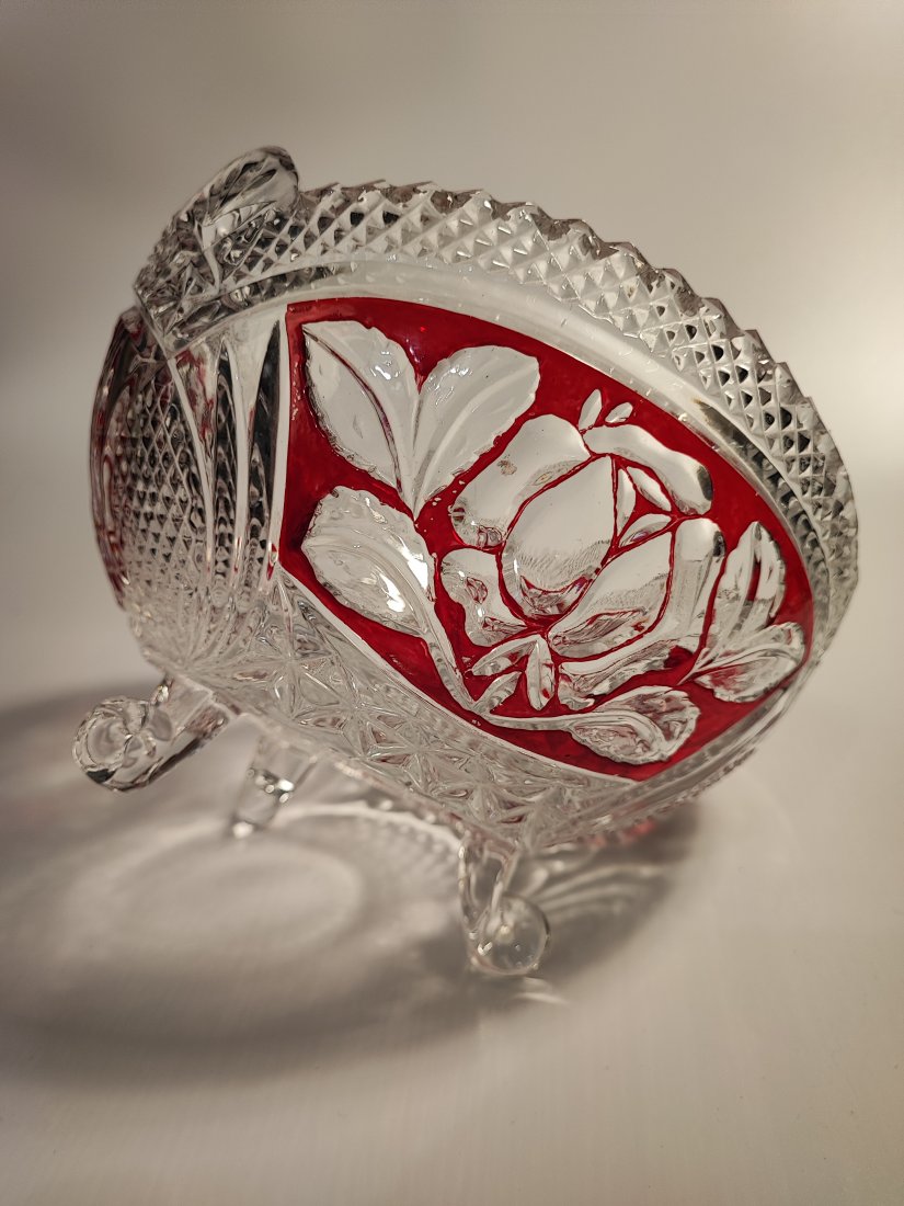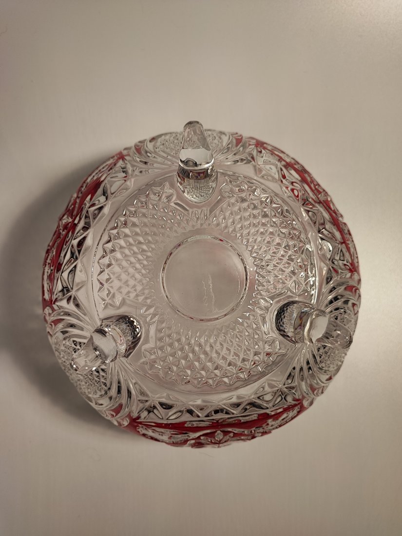 Dekoracyjna misa ze szkła kryształowego na trzech ozdobnych nóżkach, utrzymana w stylistyce niemieckich wyrobów vintage (ok. lata 60–80).