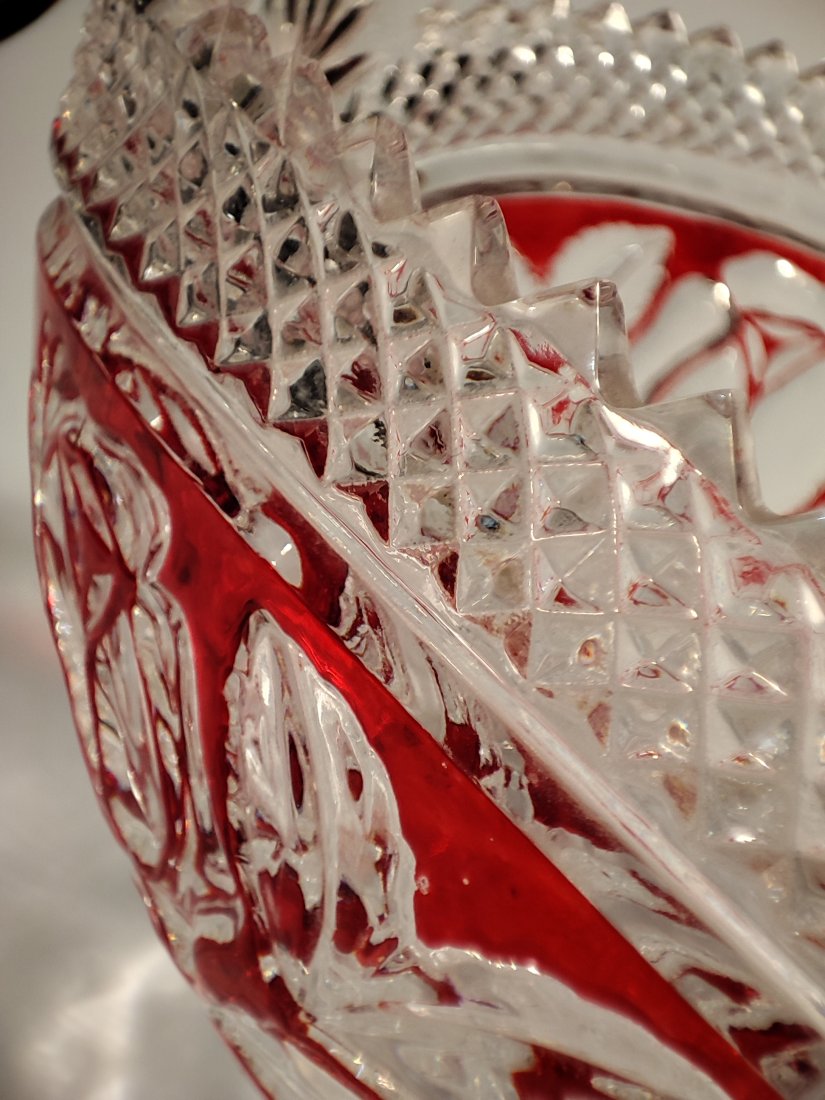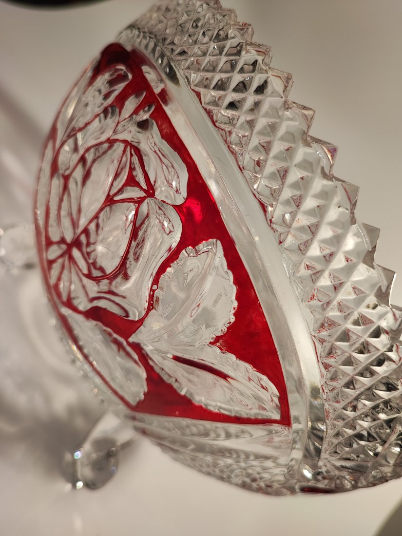 Charakterystyczne czerwone panele typu "ruby flash" oraz bogate reliefowe zdobienia roślinne sprawiają, że naczynie efektownie odbija światło i stanowi wyrazisty element dekoracyjny.