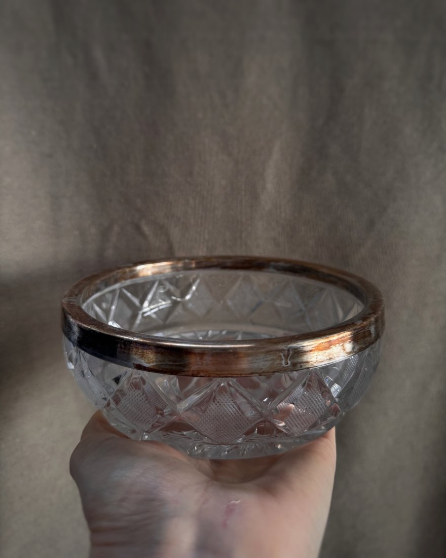 Kryształowa misa, patera, wykończona metalowym pierścieniem.