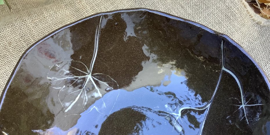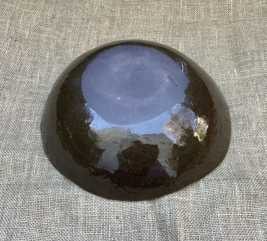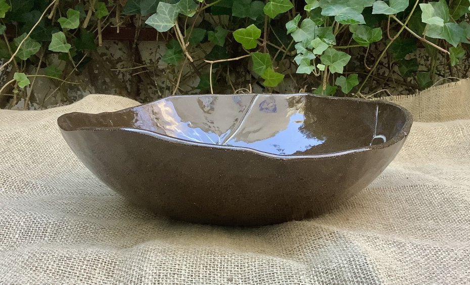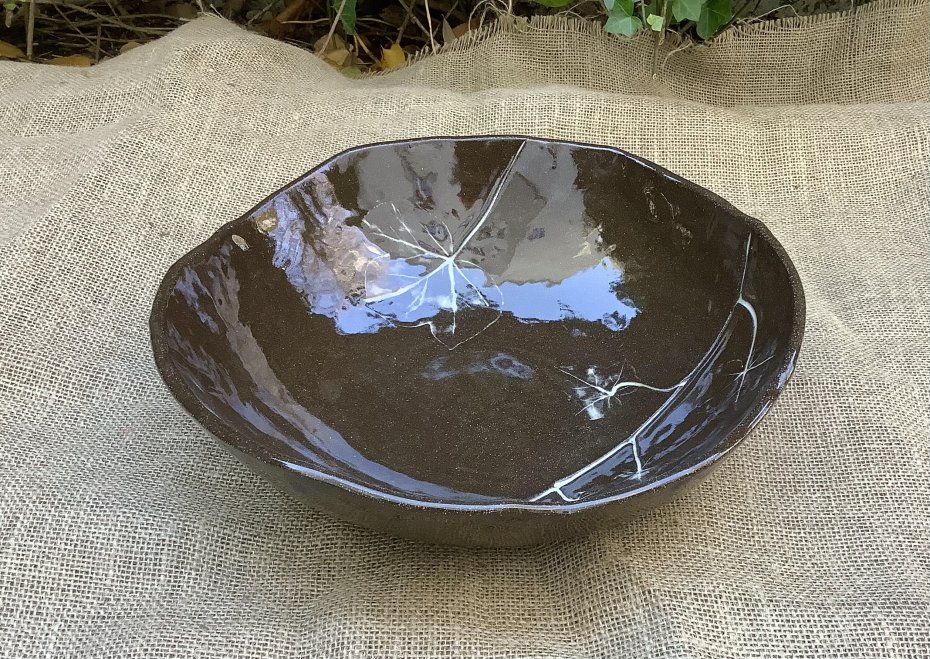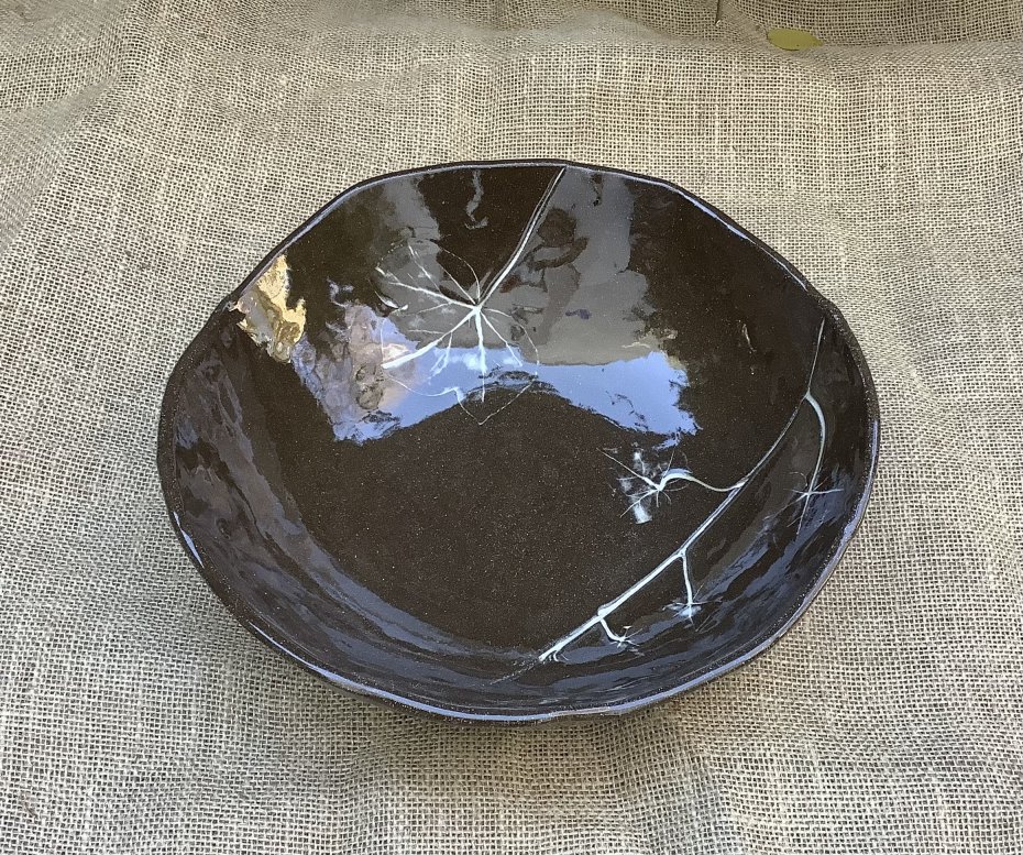 Zapraszam do zakupu misy wykonanej ręcznie z ciemnej gliny. Wewnątrz odciśnięta została gałązka z liśćmi bluszczu. Jej kontury są poszkliwione na jasno, a cała misa wewnątrz i na zewnątrz poszkliwiona transparentnym błyszczącym szkliwem.
