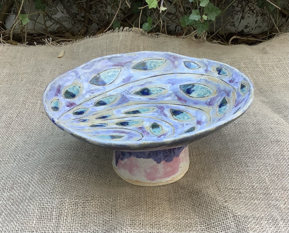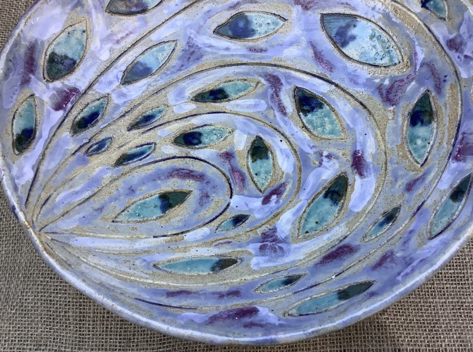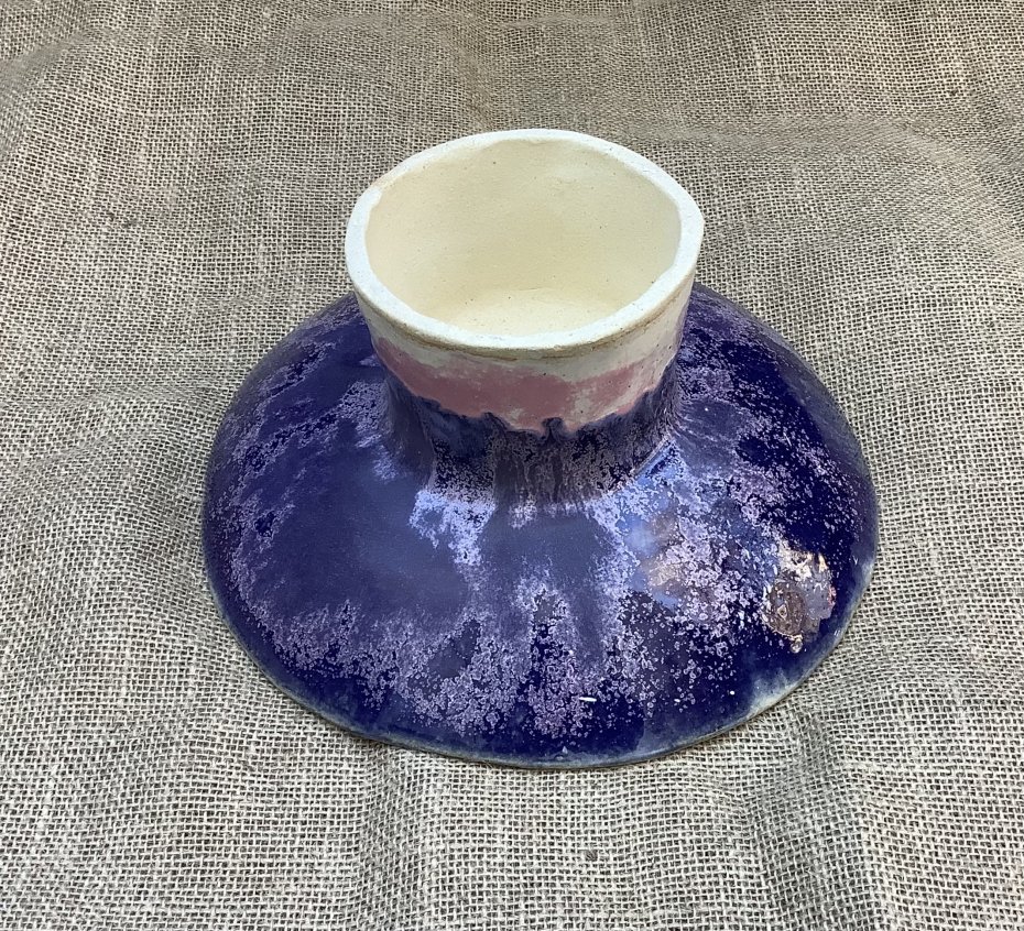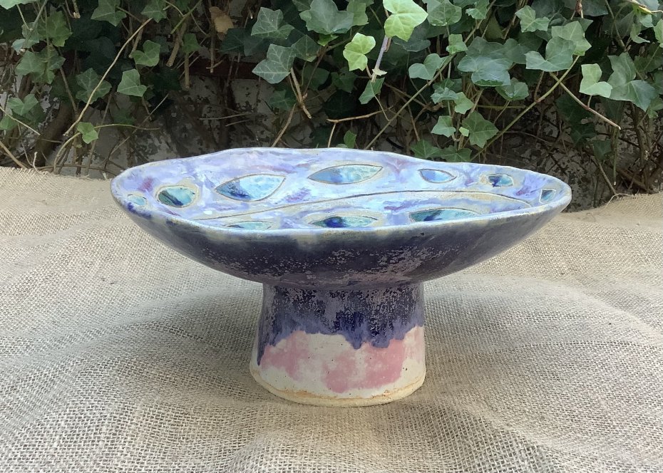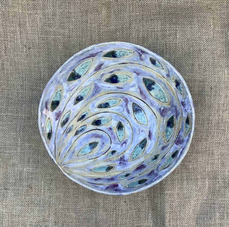 Zapraszam do zakupu misy wykonanej ręcznie z jasnej szamotowej gliny. Poszkliwiona w odcieniach fioletu, niebieskiego i granatu.