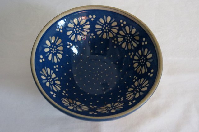 Ceramiczna miseczka, ręcznie formowana i ozdabiana, niebieska malatura, wypukły-biały wzór kwiatowy.Szkliwiona.Sygnowana pod spodem.