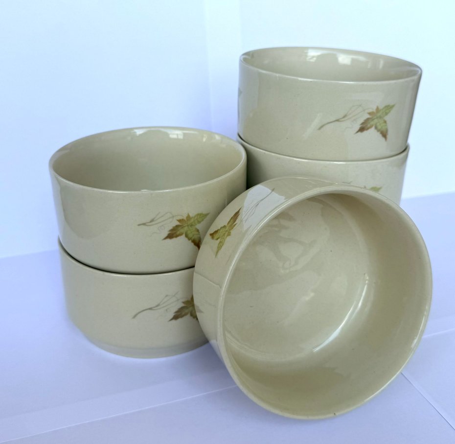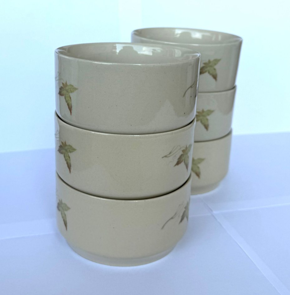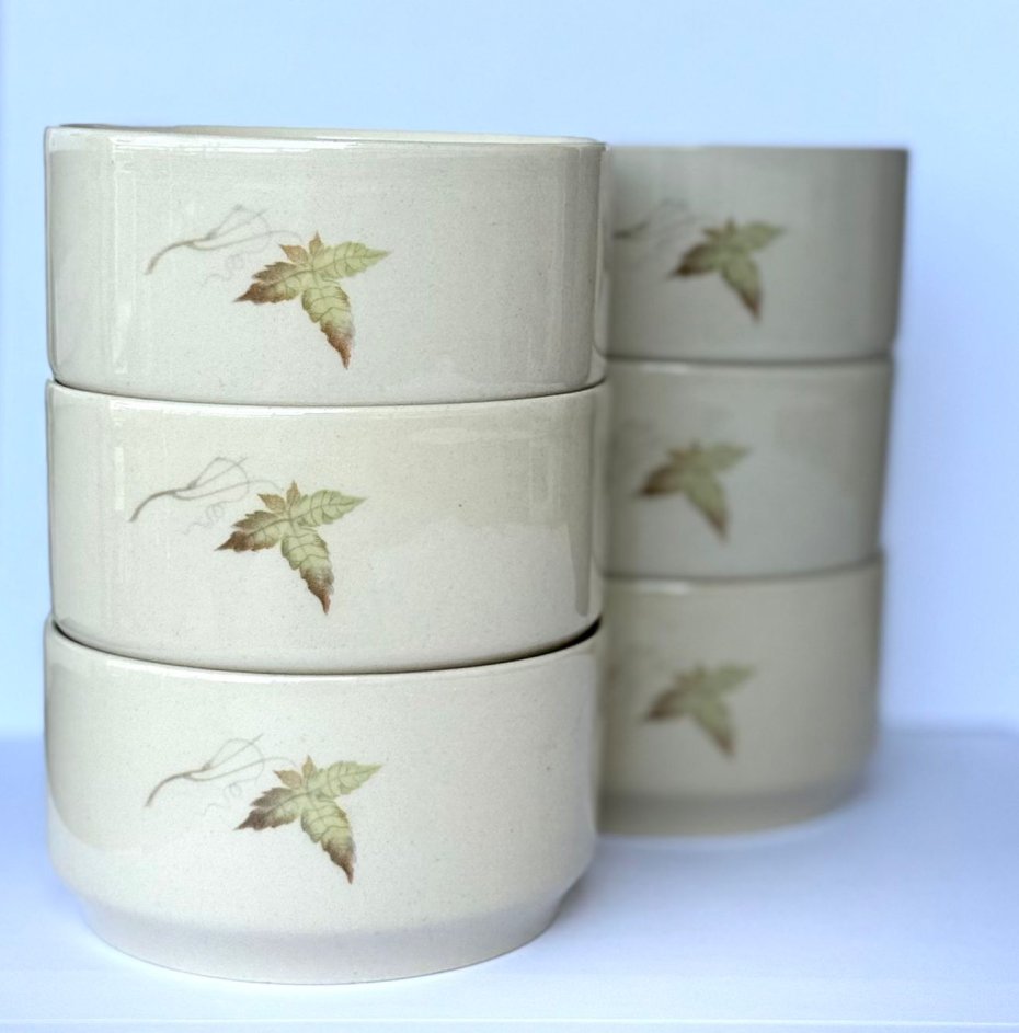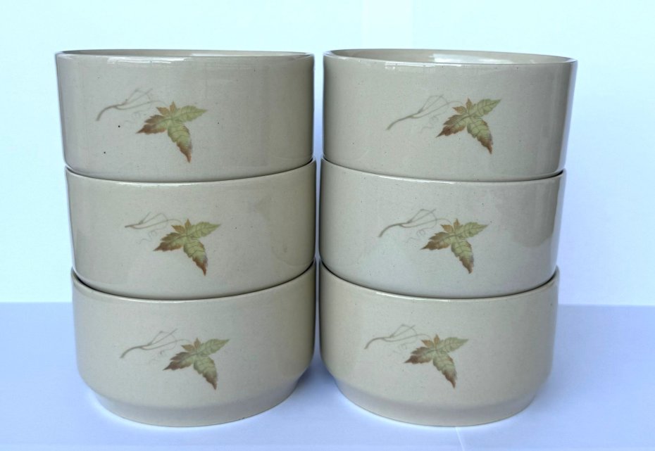 Komplet sześciu ceramicznych bigosówek z wytwórni Tułowice, wykonanych w latach 70.–80. XX wieku. Wszystkie miseczki są sygnowane od spodu charakterystycznym znakiem fabryki. Model w ciepłym, beżowym odcieniu, zdobiony delikatnym motywem liści w zielono‑brązowej tonacji – typowa estetyka Tułowic z okresu PRL, dziś bardzo poszukiwana w aranżacjach vintage i modern home.