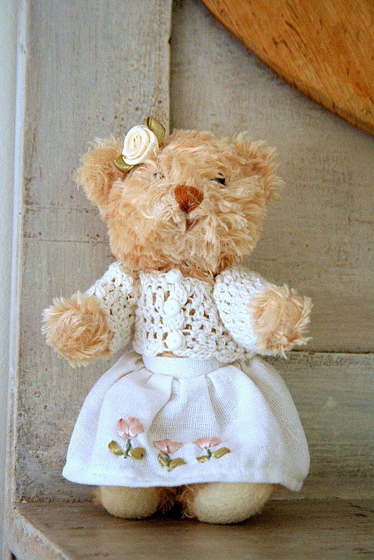 Cudowna pani misiowa w starym stylu. Ubrana w spódniczkę i szydełkowy sweterek:)