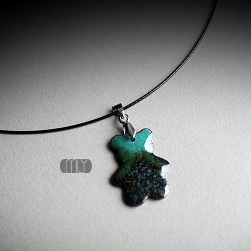 Podłużny ceramiczny wisior, ręcznie wykonany z mocno spieczonej czekoladowobrązowej gliny kamionkowej, jednostronnie szkliwiony mieszanką fioletowo błękitnych szkliw z efektem plamek, tył surowy,ciemnobrązowy, zawieszony na lince jubilerskiej z zapięciem, w kolorze srebrnym. Długość listka ok. 3,5cm, obwód linki ok 44cm. Polecam
