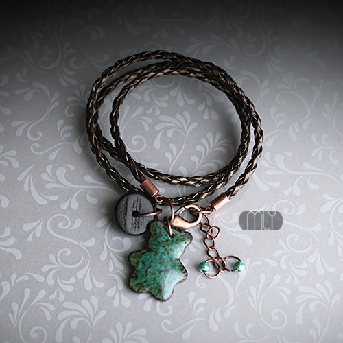 Efektowna bransoletka wykonana z plecionego ekologicznego rzemienia jubilerskiego w kolorze brązowym, elementów w kolorze miedzianym i ręcznie wykonanego ceramicznego elementu szkliwionego mieszanką zielonych szkliw z efektem plamek ( Istnieje możliwość zamówienia Misiaczka w innych kolorach)Obwód regulowany. Polecam
