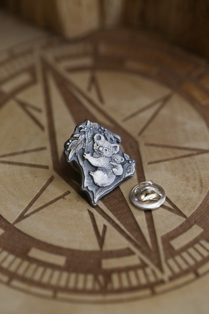 Misie koala są jednymi z dzikich zwierzaków spod znaku marki Cztery Humory. Pin powstał według autorskiego projektu widocznego na zdjęciu. Srebro pokryto oksydą, nadającą mu stalowo - szary odcień i przetarto dla wydobycia szczegółów wzoru. Na rewersie znajduje się szpic do zapięcia "motylka".