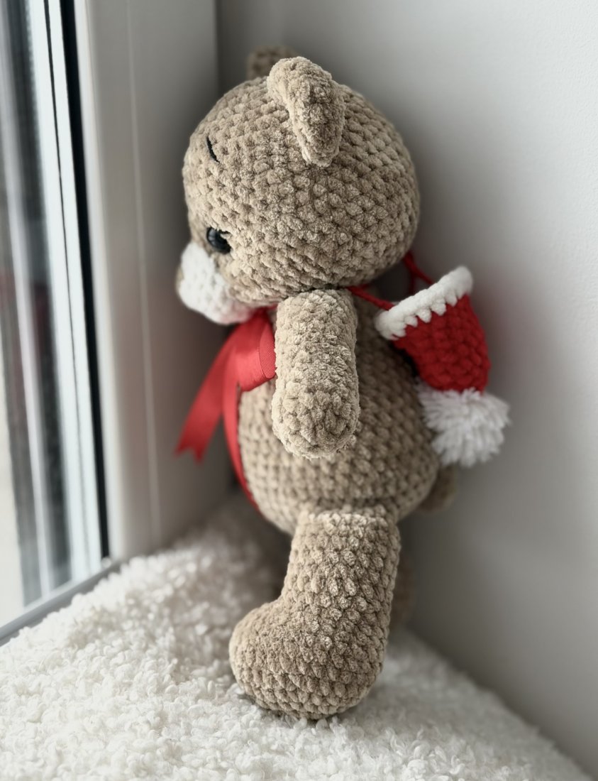 Miś jest miękki, przyjazny i gotowy na zimowe przygody — wystarczy mu tylko kubek kakao (lub dodatkowy przytulasek!).