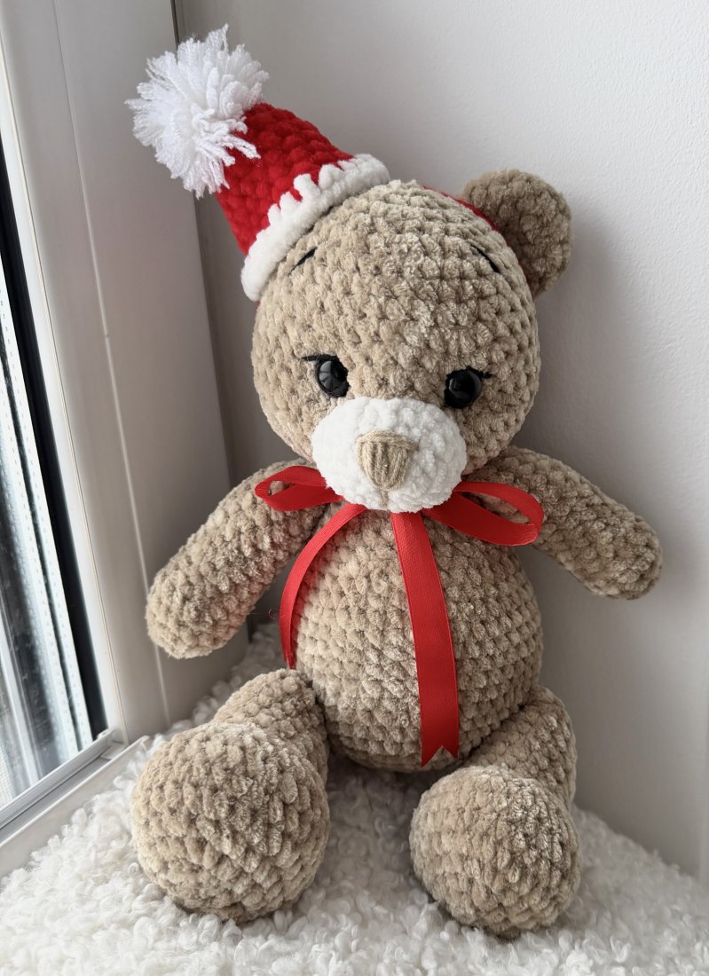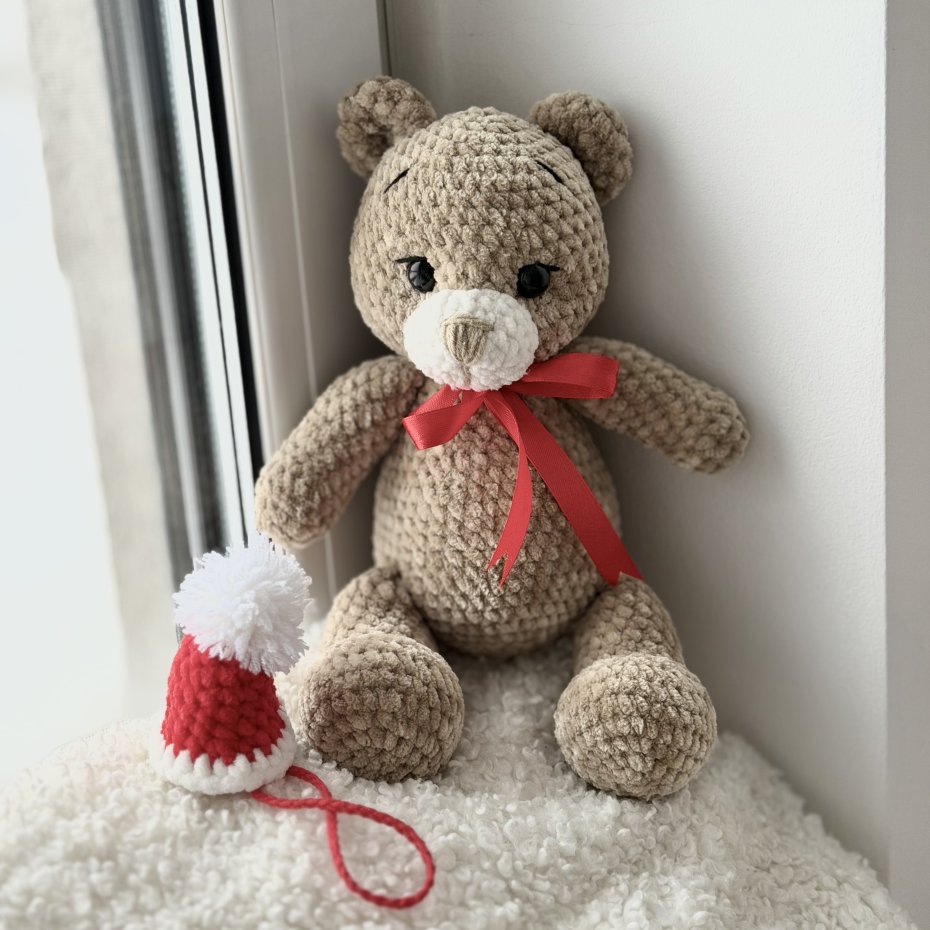 Miś ma elegancką czerwoną kokardkę, a do kompletu dodaję także małą czapeczkę Mikołaja, którą możesz zakładać i zdejmować kiedy tylko chcesz.