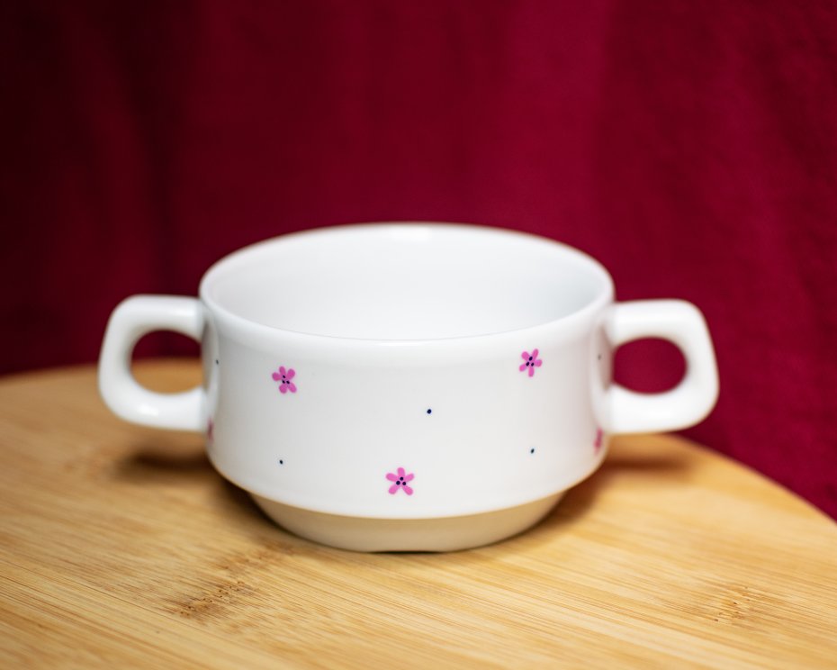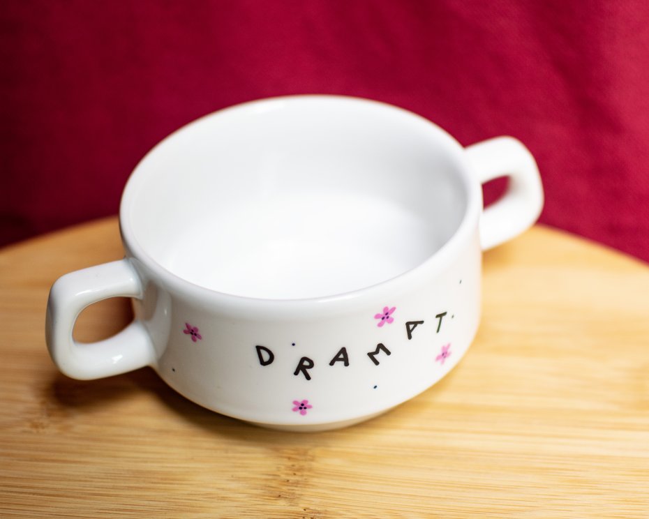 Ręcznie malowana miska bulionówka z drugiego obiegu. Ozdobiona napisem DRAMAT oraz różowo-granatowymi kwiatkami i granatowymi kropkami.