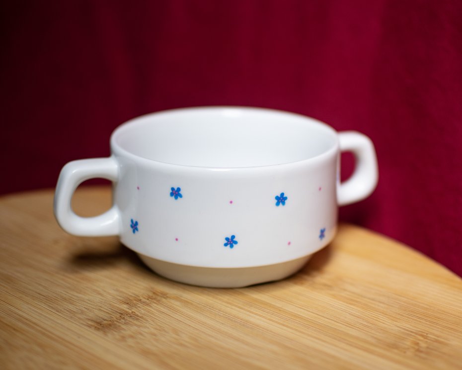 Ręcznie malowana miska bulionówka z drugiego obiegu. Ozdobiona napisem WY*EBANE oraz niebiesko-różowymi kwiatkami i różowymi kropkami.