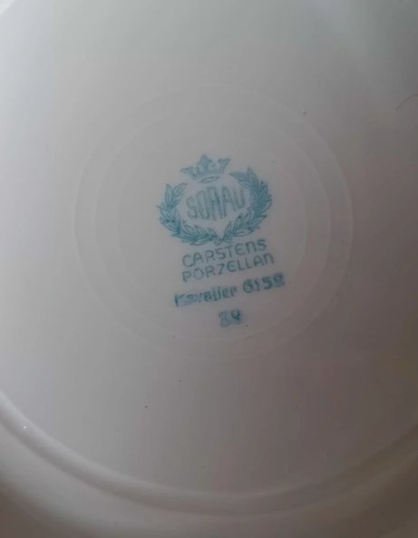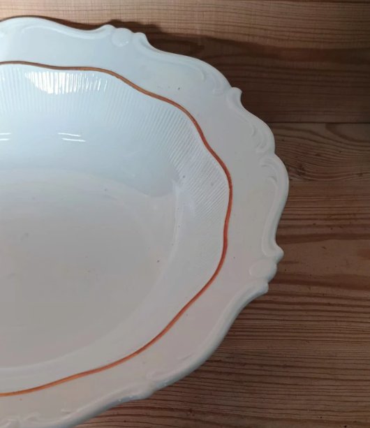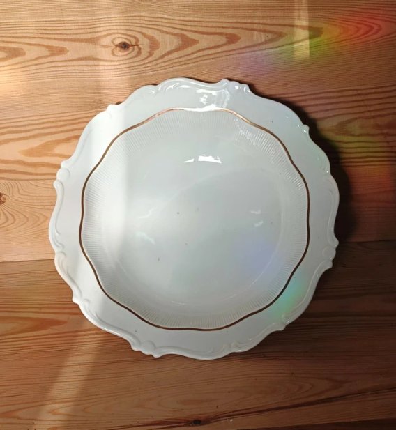 Śliczna miska, salaterka z białej porcelany ze złoceniami. Sygnowana Sorau. Średnica 27 cm, wysokość 8 cm