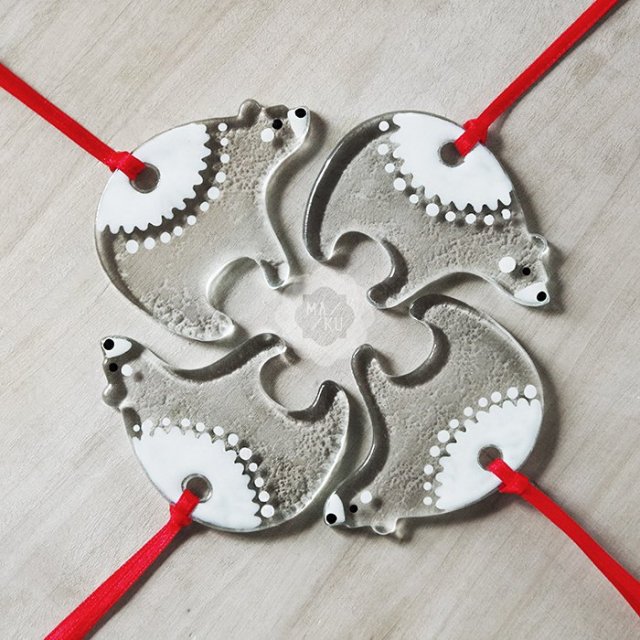 Zestaw czterech autorskich świątecznych zawieszek na choinkę wykonanych ze szkła metodą fusingu. Elementy wykonane ze szkła bezbarwnego z ręcznie malowanym i wypalanym wzorem na powierzchni. Spód szkła posiada delikatną fakturę ciekawie odbijającą światło.