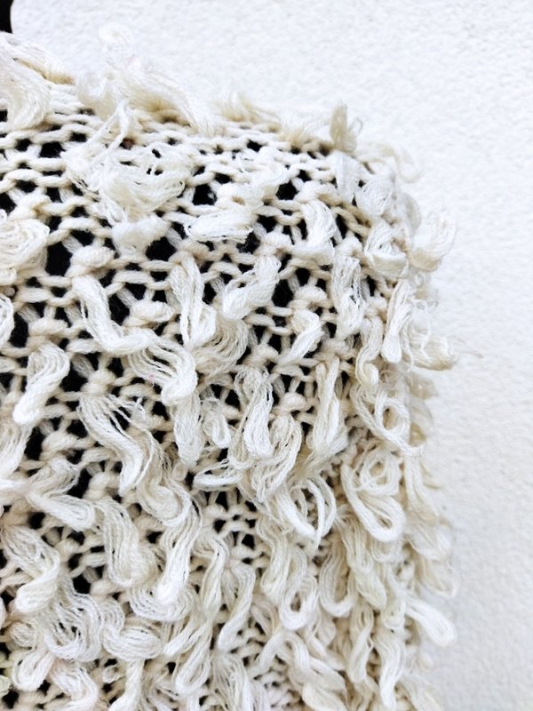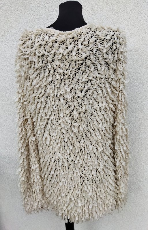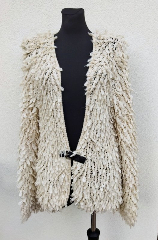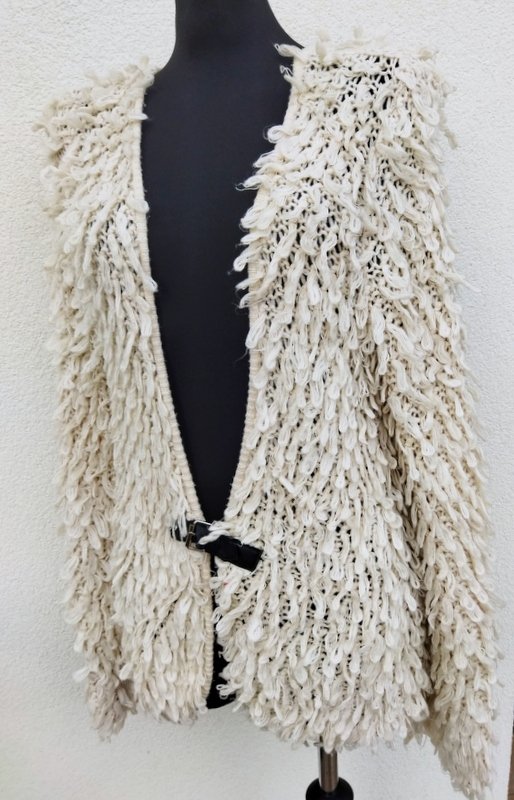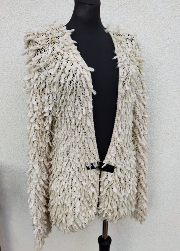 Ciekawy sweter z akrylowej włóczki w kolorze złamanej bieli z supełkami przypominającymi ptasie pióra. Dekolt w szpic, poły przodu lekko zaokrąglone, zapinany w pasie na czarny paseczek k z klamerką.