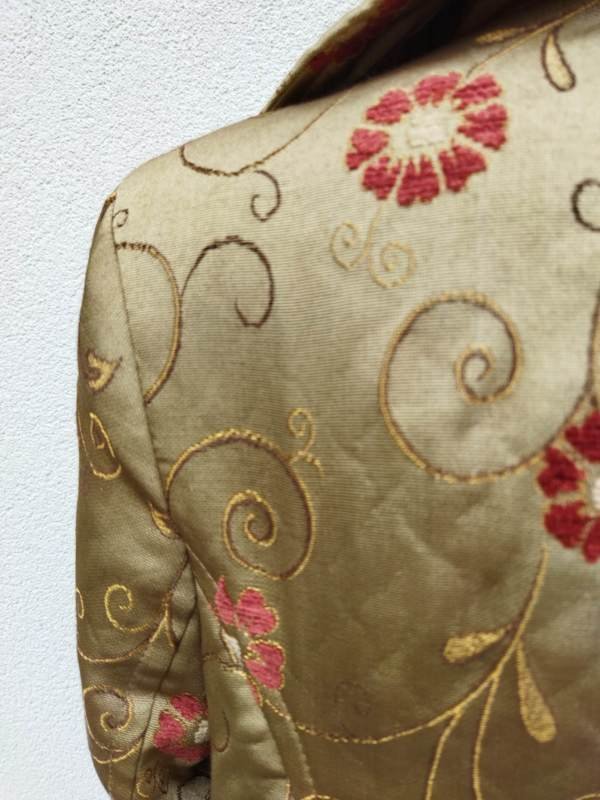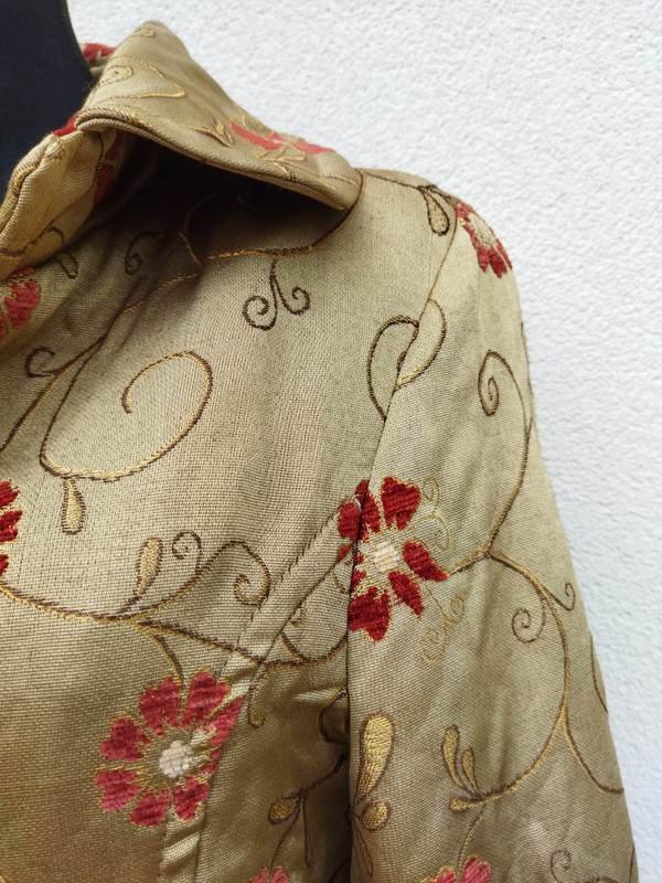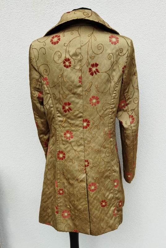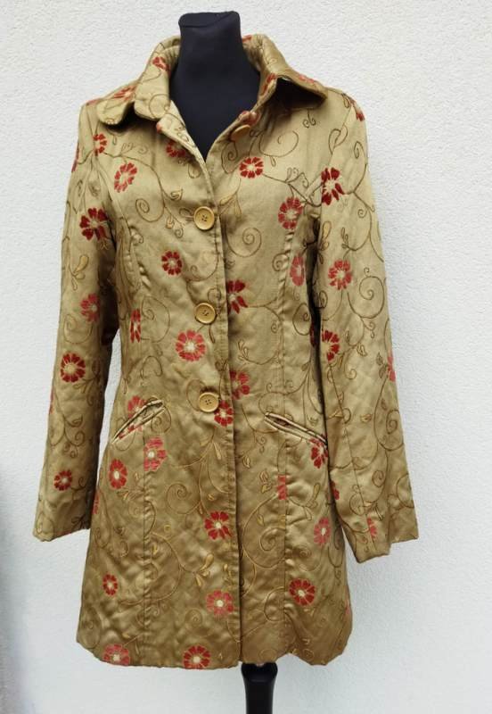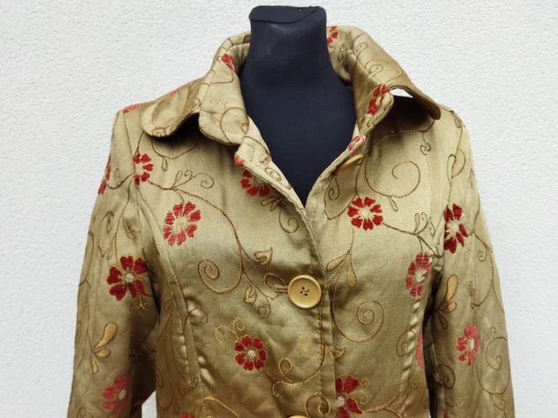 Cudny wiosenny płaszczyk w oliwkowo złocistym kolorze w całości pokryty haftem kwiatowym: łodyżki w kolorze trochę ciemniejszej oliwki podkreślone złocista nitką, kwiaty w kolorze ciemno czerwonym - faktura kwiatów z lekkim meszkiem. Fason lekko dopasowany, zapięcie na sygnowane guziki, okrągły kołnierzyk na stójce, dwie ukośne wpuszczane kieszenie, z tyłu rozcięcie. Całość na podszewce.