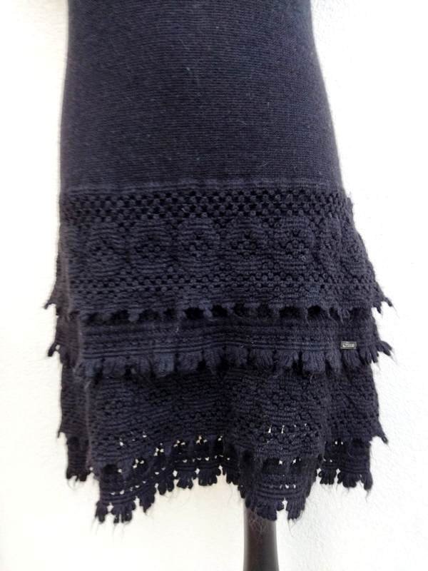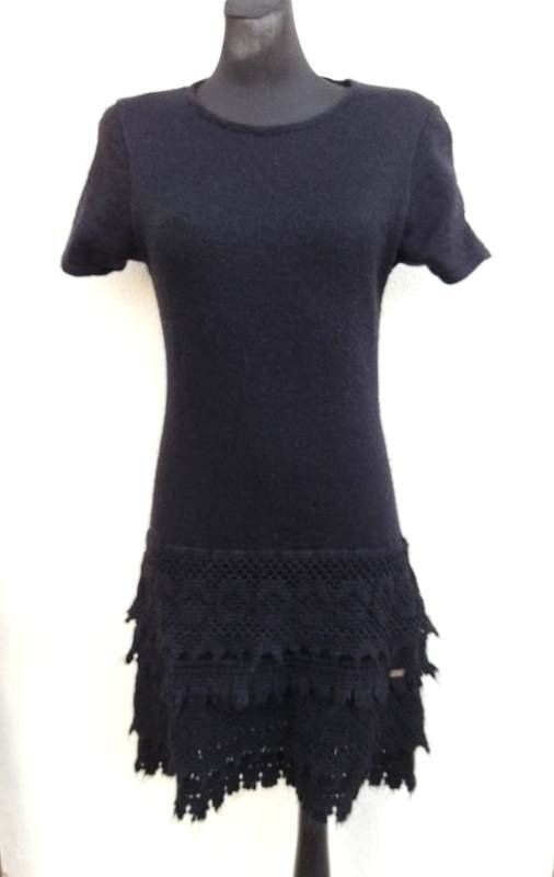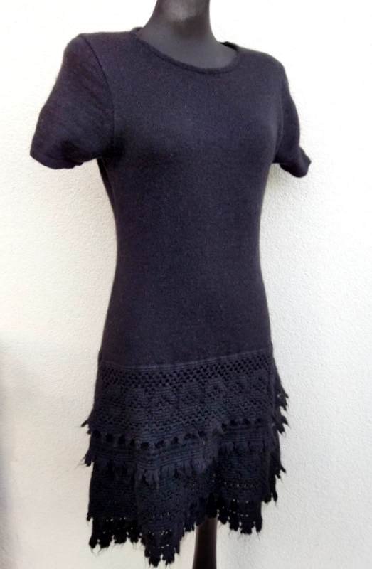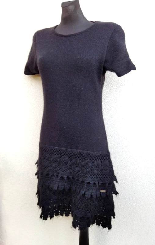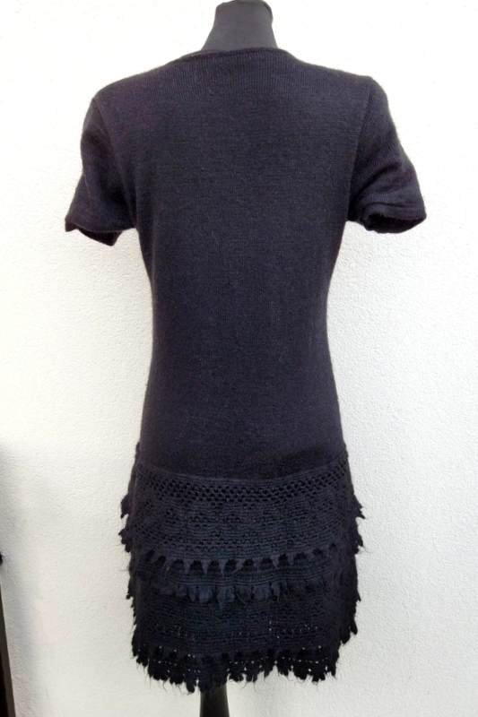 Ciepła dzianinowa sukienka najprawdopodobniej z wełnianej włóczki, w czarnym kolorze. Taliowana , z owalnym dekoltem z czterema doszywanymi koronkowymi falbanami z tej samej włóczki. Na rozciągliwej podszewce.