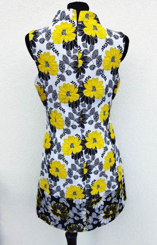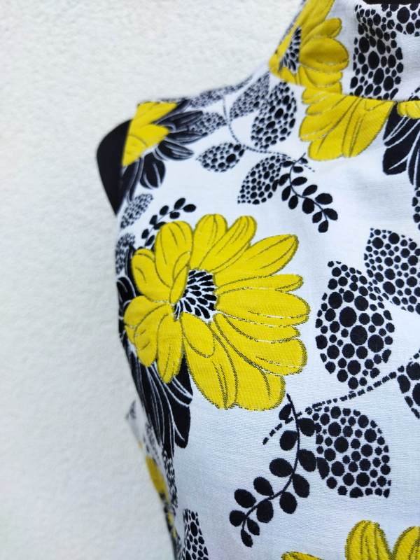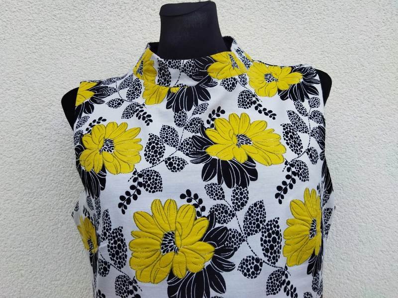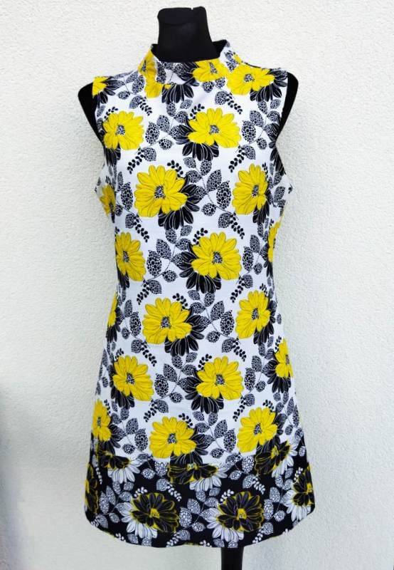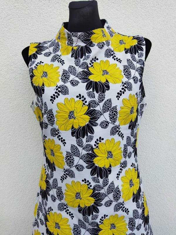 Sukienka z poliestrowo-bawełnianej tkaniny w żółte i czarne kwiatowe wzory na białym tle. Taliowana, z kołnierzem stójką , poszerzana do dołu. Zapinana z tyłu na długi zamek . Bez podszewki.