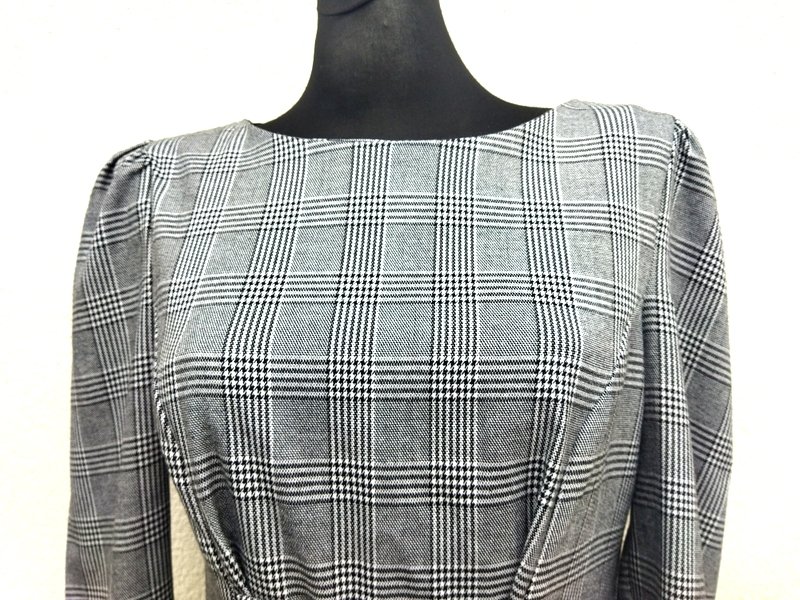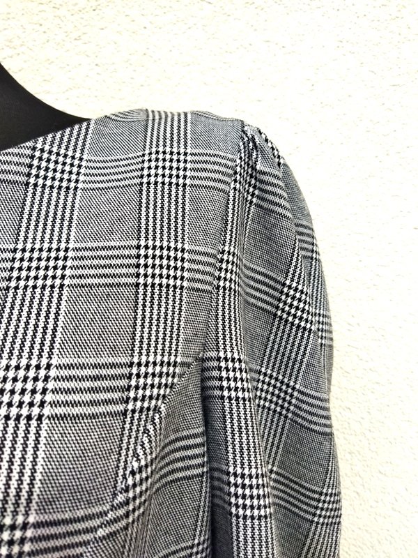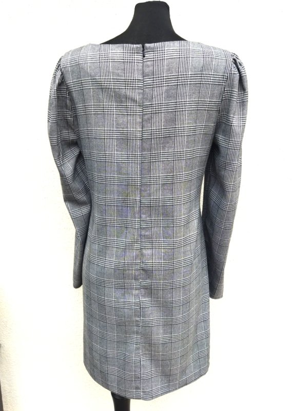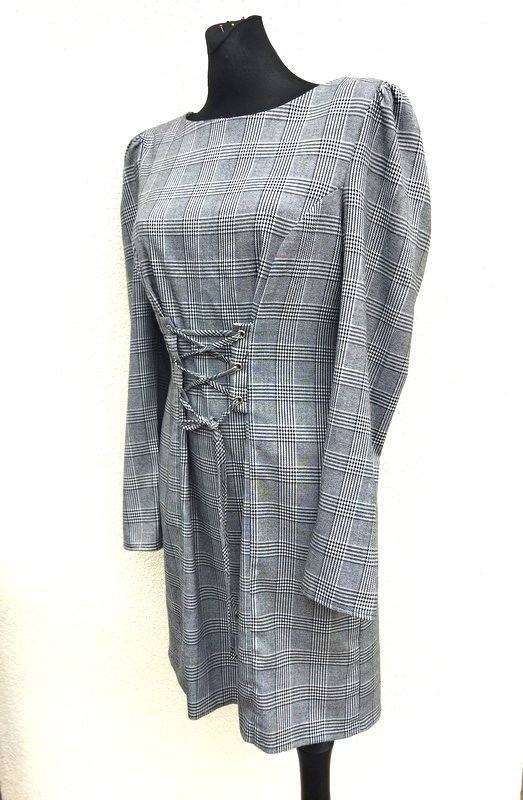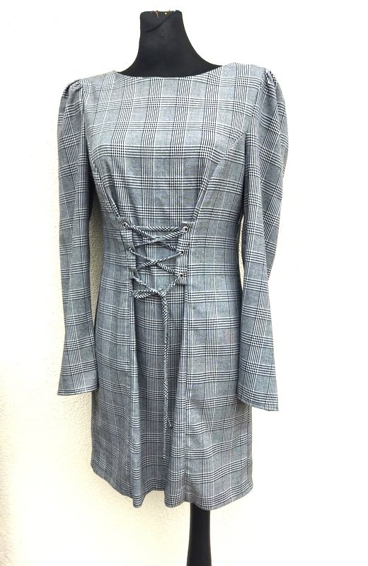 Sukienka z miłej poliestrowo-wiskozowej tkaniny w biało-czarną pepitkę ze sznurowaniem z przodu w talii. Lekko taliowana , z owalnym dekoltem, rękawy w główce lekko bufiaste. zapinana z tyłu na długi zamek
