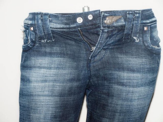 oryginalne włoskie Jeansy, marki Miss sixty w rozmiarze 28. Świetne detale, nogawki na dole od wewnątrz mają zamki. Materiał 98% bawełna, 2% elastan, ale jakby o lnianym splocie. Materiał fabrycznie przecierany. Kolor jakby granatowo-szary. Stan bardzo dobry-. Podaję wymiary mierzone na płasko;