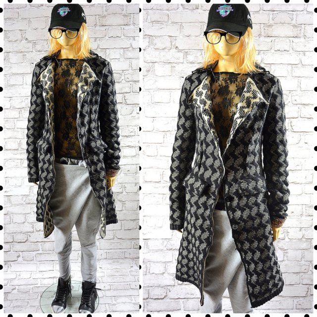Świetny wełniany płaszczyk od Miss Sixty o poszerzanym kroju zapinany na guziki, kolor czarny w białe wzory, po bokach kieszonki, na jednym z rękawów logo marki, z tyłu krótkie rozcięcie.