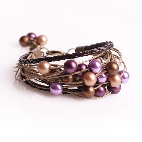 :) Bransoleta w jesiennej gamie śliwkowych fioletów i matowych brązów. Doskonale uzupełni makijaż. Zbudowana ze szklanych pereł wielkości 8 mm, lnianych linek, i plecionych ekologicznych brązowych rzemieni. Zakończenia w kolorze starego złota. Na łańcuszku przedłużającym dodatkowe koraliki i uroczy kluczyk. Opakowanie hand made. Rozmiar: 19-21 Aby zamówić inny rozmiar bardzo proszę o info przy złożeniu zamówienia.