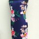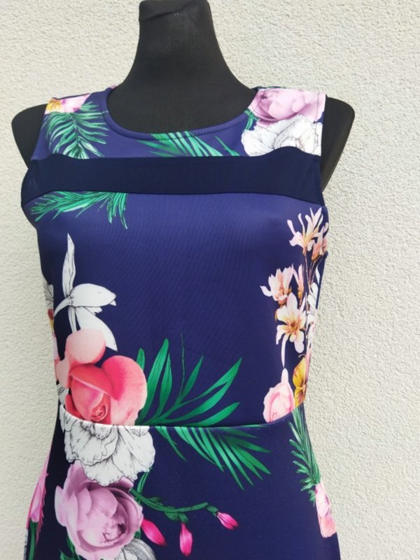 Ołówkowa sukienka z poliestrowej tkaniny dzianinowej z kwiatowym wzorem w żywych kolorach na granatowym tle z granatowymi poziomymi wstawkami z transparentnej tkaniny. Wkładana przez głowę - bez zamka. Bez podszewki.