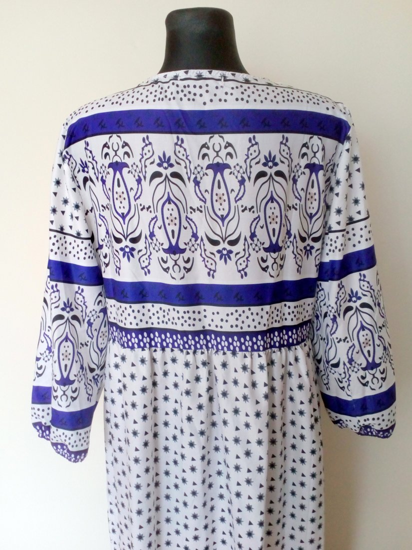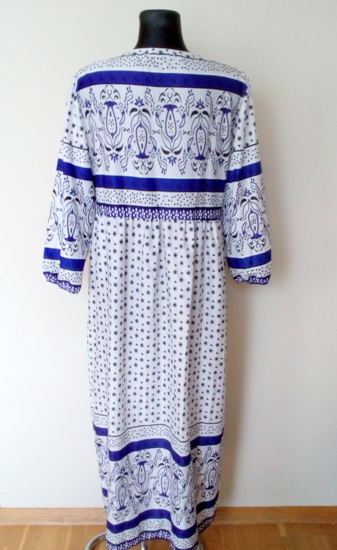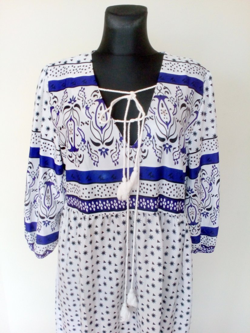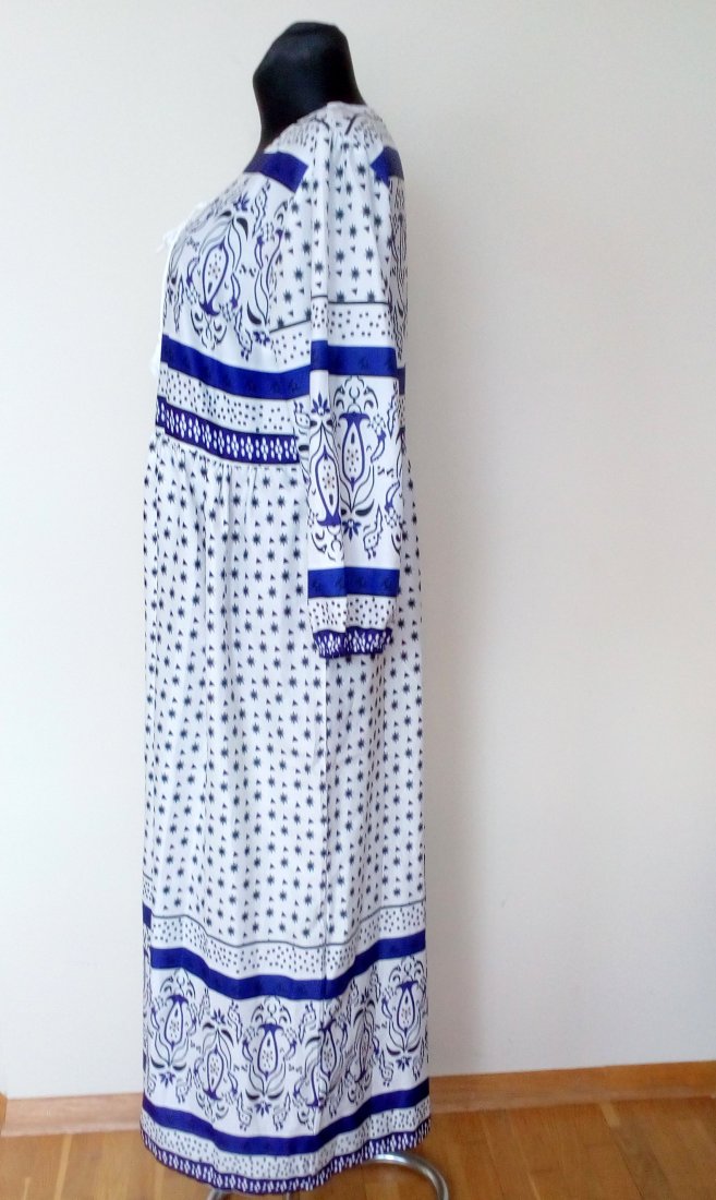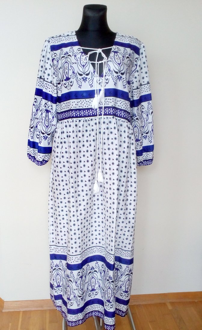 Maxi sukienka w kolorach: biały, niebieski, czarny, szary i śladowe ilości beżu. Dekolt w szpic wiązany w dwóch miejscach sznurkami z chwostami, odcinana w pasie, od pasa marszczona, rękaw 3/4 z wciągniętą gumką u dołu