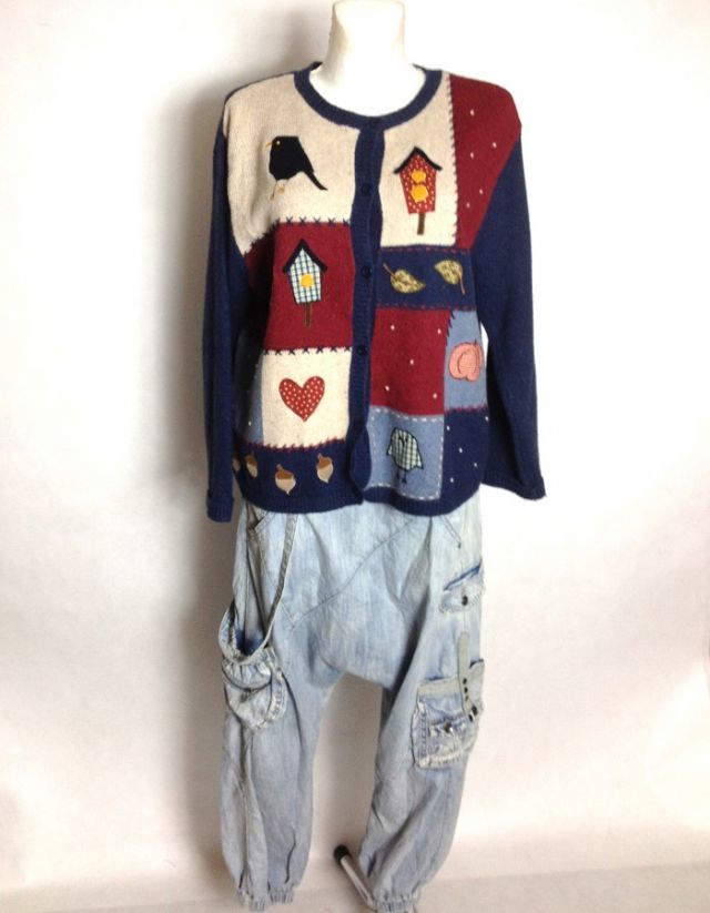Markowy świetny sweter zapinany na guziki, z przodu ma naszyte jakby łatki w postaci ; ptaszków , karmników, grzybków,listków, serca.Z tyłu same grzybki.