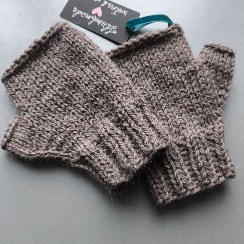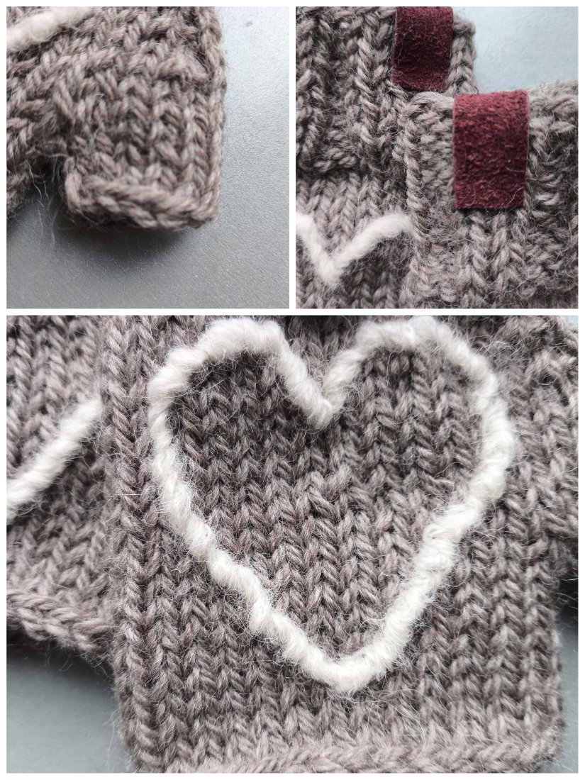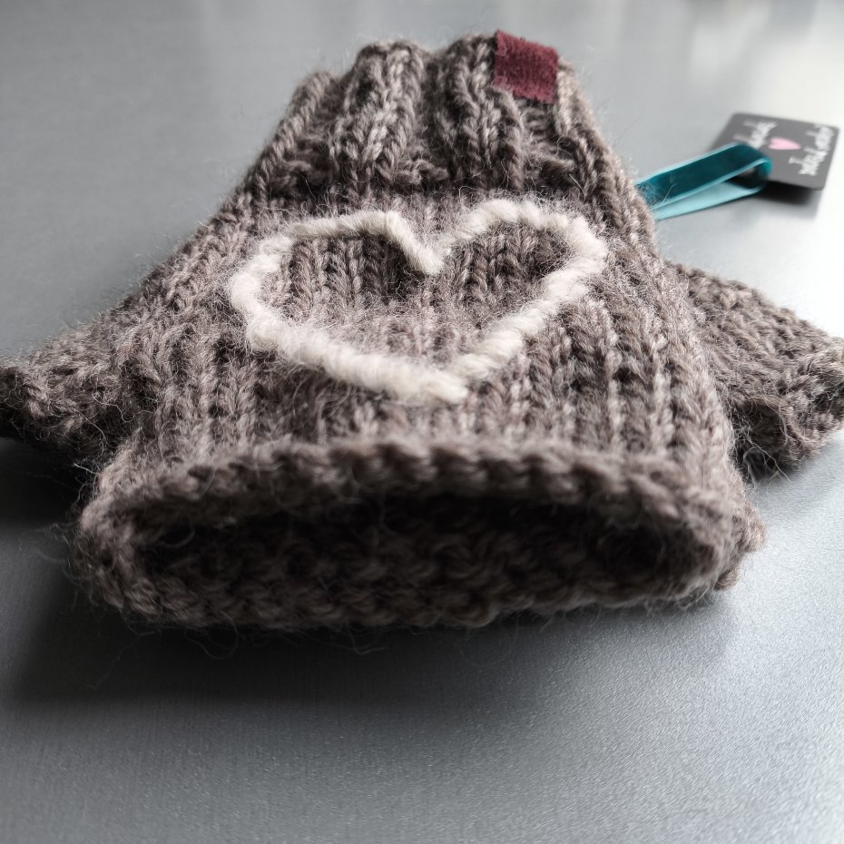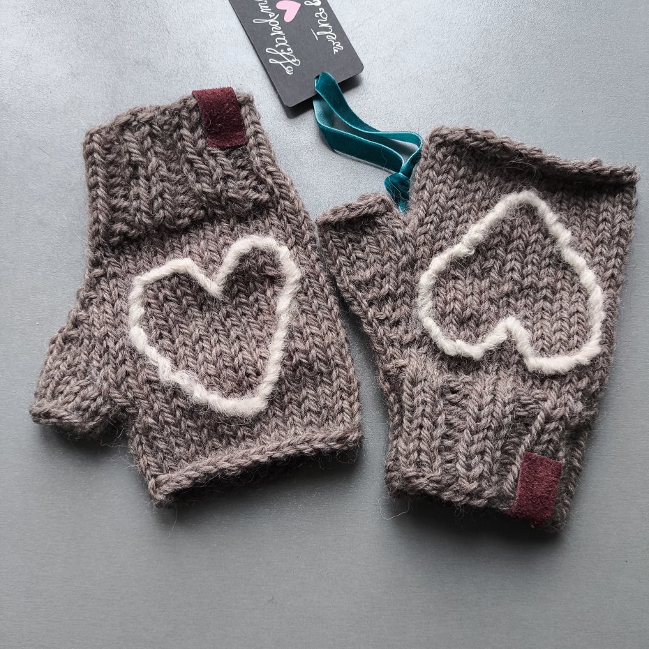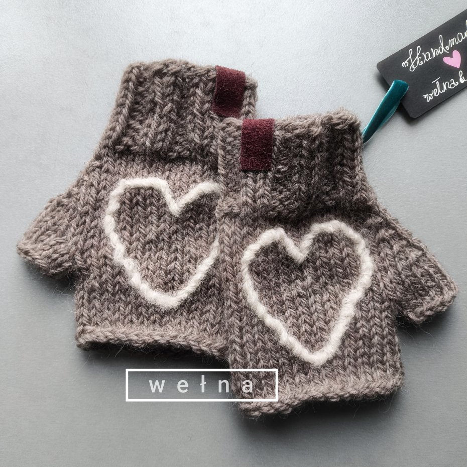 Wełniane mitenki w kolorze ciemnego beżu z sercami w kolorze ecru. Zostały wydziergane metodą bezszwową.