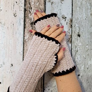 Miękkie i bardzo ciepłe mitenki wykonane ręcznie z włoczki Himalaya Dolphin Baby. Mitenki są w kolorze cappuccino z ciemnobrązową obwódką. Idealne na spacery i do prowadzenia samochodu. Nie krępują ruchów dłoni przy pracy na komputerze. Długość rękawiczek 21 cm. Należ prać je ręcznie w temperaturze do 40 stopni.